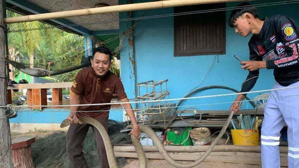 ชาวบ้านแหลมสักระทึก! งูจงอางขนาดใหญ่ลายลูกหวาย ยาวถึง 4 เมตร เลื้อยซุกข้างบ้าน เจ้าของบ้านเดินเล่นอยู่ดีๆ ถึงกับผงะเมื่อเจองูตัวใหญ่โผล่พรวด ชาวบ้านกว่า 10 คนต้องช่วยกันล้อมหวั่นงูหลบหนี ก่อนแจ้ง “ต๊ะอั๋น อสรพิษ” นักจับงูมือเปล่าประจำถิ่นมาช่วยจัดการ