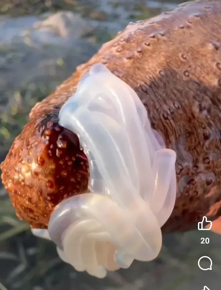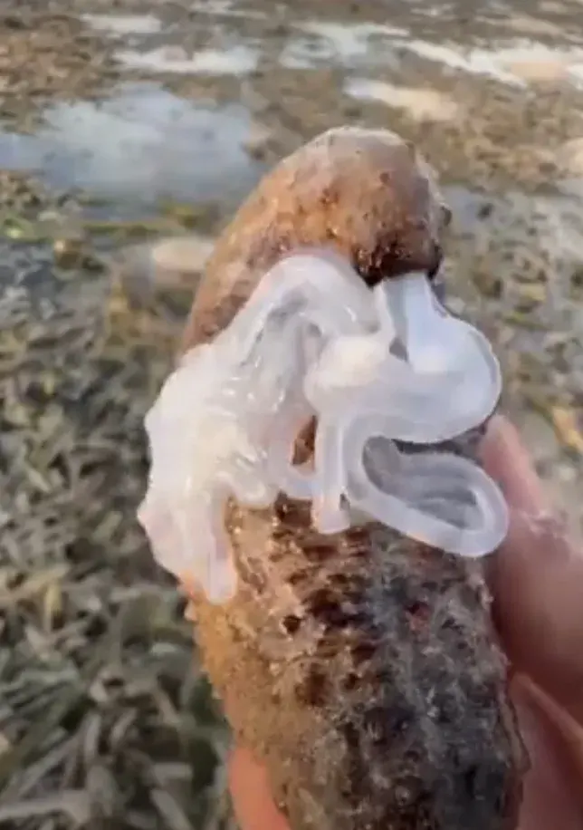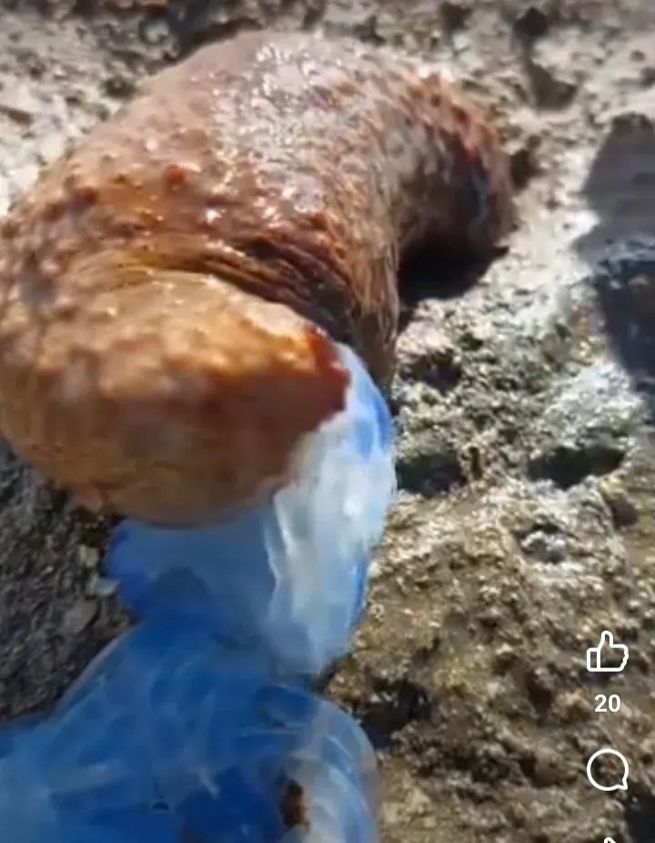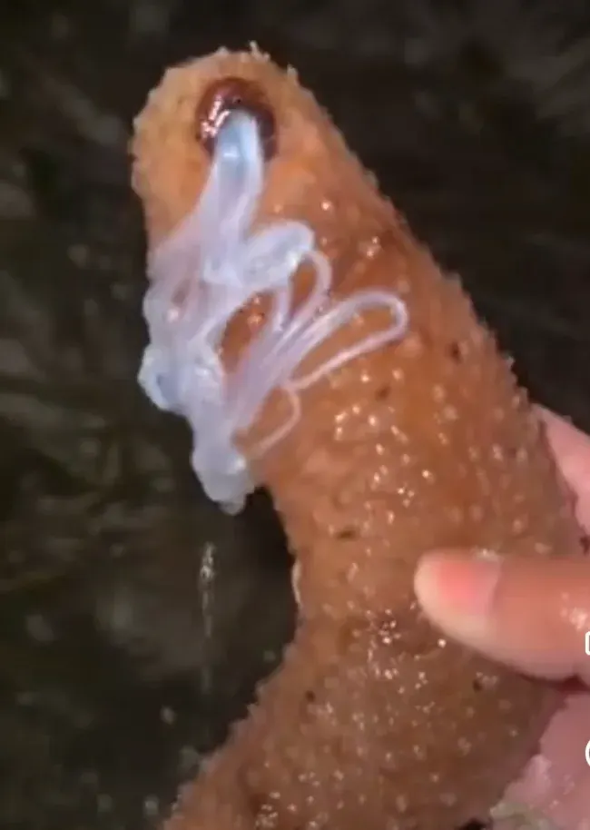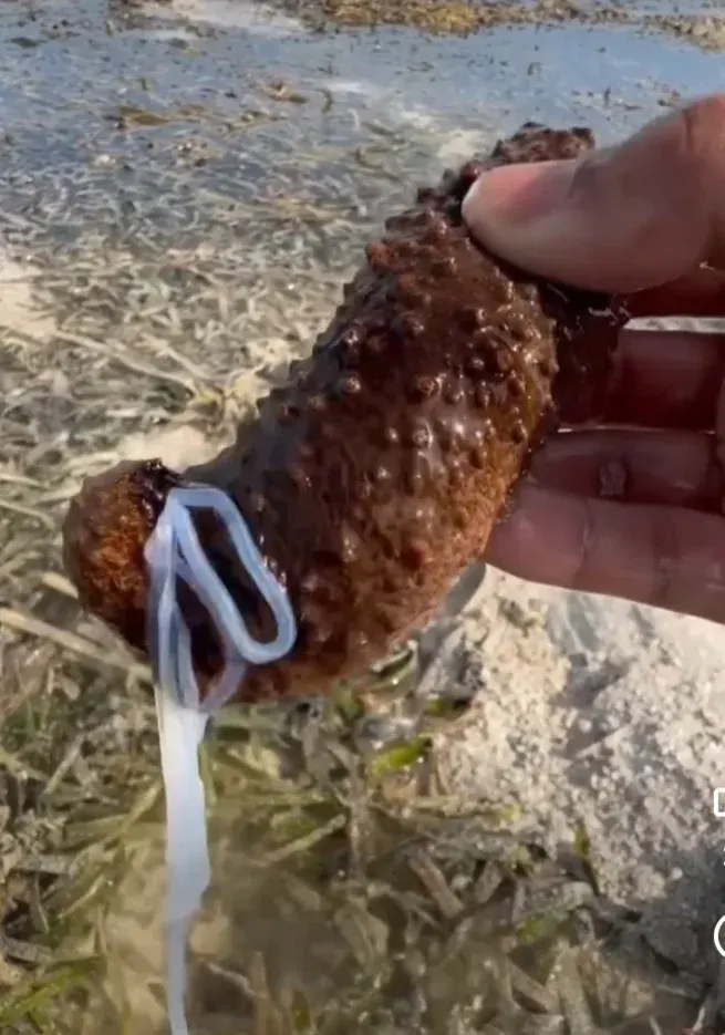 หากสิ่งมีชีวิตนี้ปล่อยเส้นใยขาวๆออกมาจากปากมัน ให้รีบโยนทิ้งทันที ซึ่งนี่คือแตงกวาทะเลหรือปลิงทะเลเป็นสัตว์ทะเลที่ไม่มีกระดูกสันหลัง และสิ่งที่มันพ่นออกมาจากปาก คือท่อคูเวียร์เป็นอวัยวะภายในของปลิงทะเลบางชนิด พวกมันจะพ่นออกมาก็ต่อเมื่อรู้สึกโดนสัมผัส