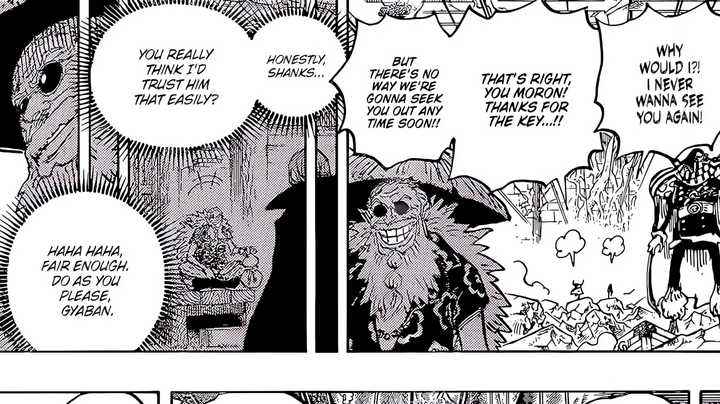 การที่แชนค์สขอให้กาบันทดสอบความแข็งแกร่งของลูฟี่ก่อนจะมอบกุญแจให้เขาเป็นรายละเอียดเล็กๆ น้อยๆ ที่อาจส่งผลต่อเรื่องราวของเอลบัฟอย่างมาก หากกัปตันผมแดงขอให้เพื่อนของเขาดูว่าลูกศิษย์ของเขาพร้อมที่จะต่อสู้กับเจ้าชายผู้ต้องคำสาปหรือไม่ ก็มีความเป็นไปได้สูงที่การเดินทางของกลุ่มหมวกฟางไปยังดินแดนแห่งยักษ์จะเป็นส่วนหนึ่งของแผนของแชนค์ส ชายคนนี้อาจพยายามใช้โลกิเป็นบททดสอบเพื่อดูว่าลูฟี่เติบโตขึ้นมากแค่ไหนในช่วงสองสามปีที่ผ่านมา