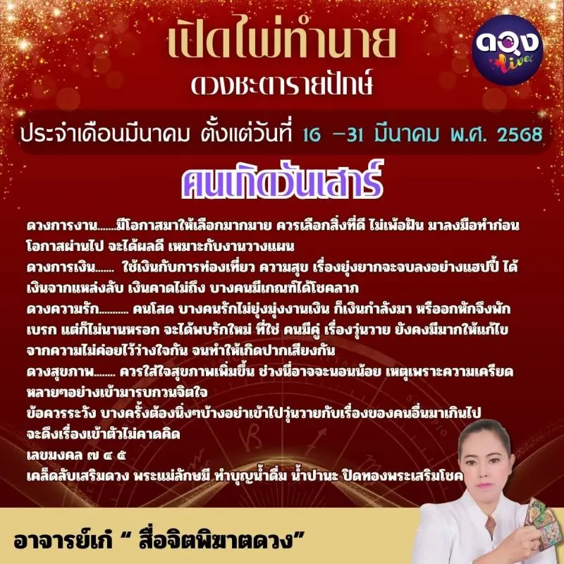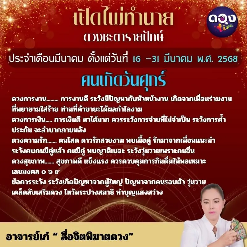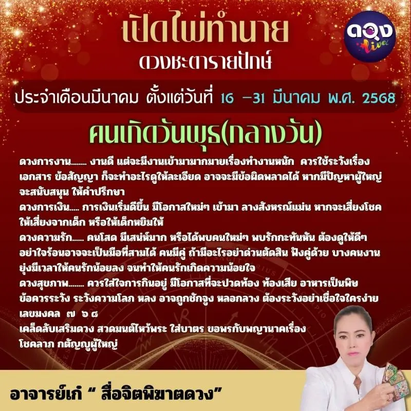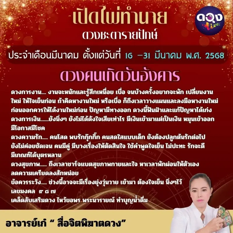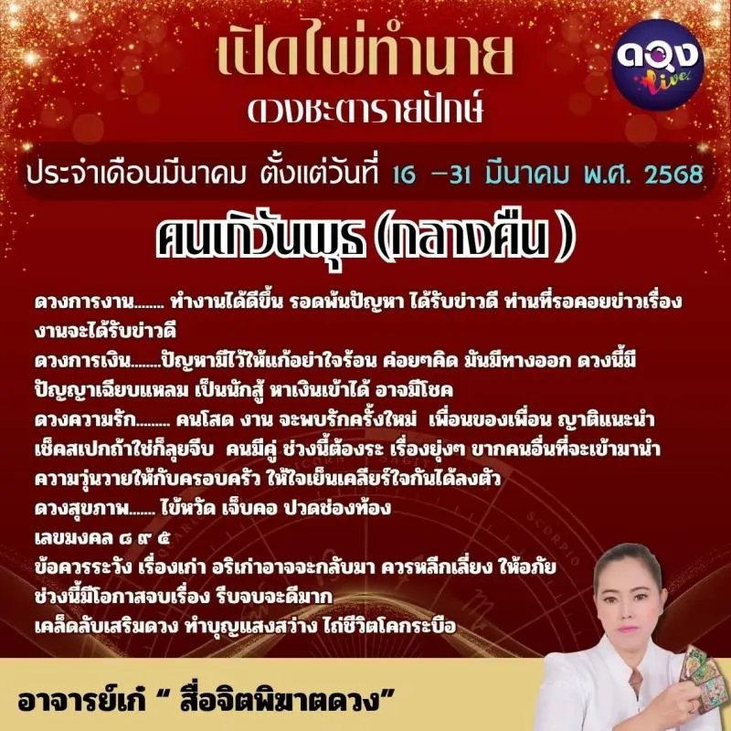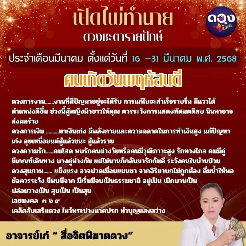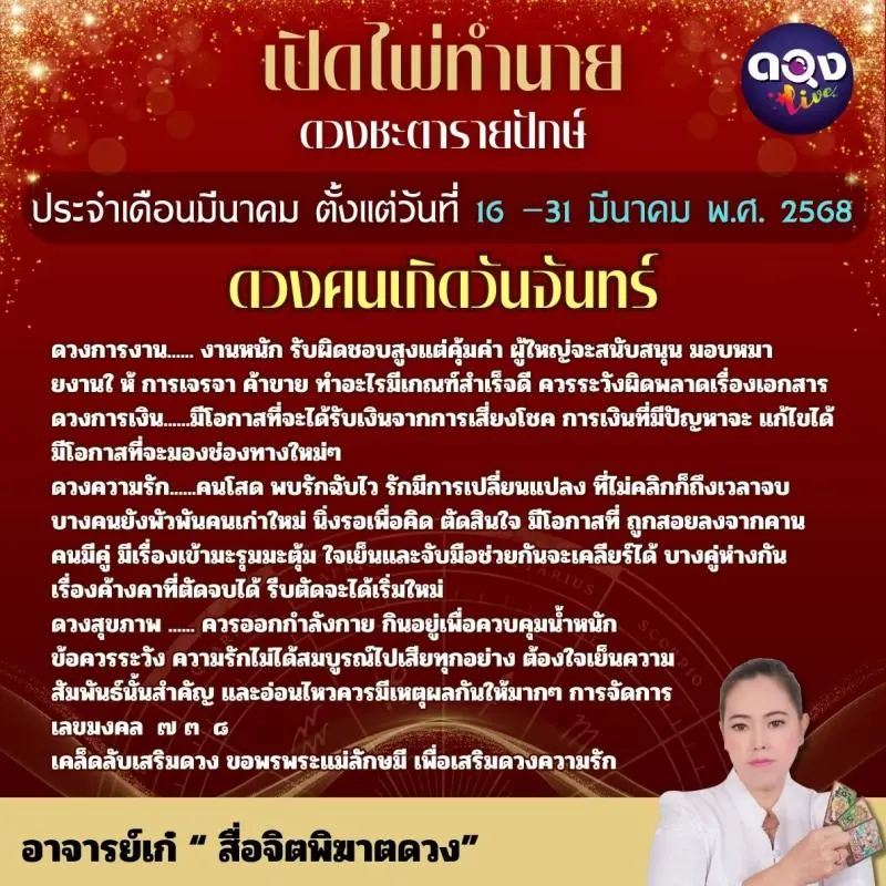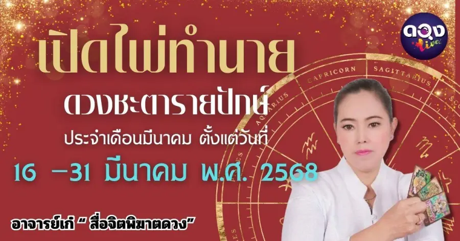 เปิดไพ่ทำนายดวงชะตารายปักษ์ ประจำเดือนมีนาคมตั้งแต่วันที่๑๖ –๓๑ มีนาคม พ.ศ. ๒๕๖๘ ทำนายโดย อาจารย์เก๋ “ สื่อจิตพิฆาตดวง”