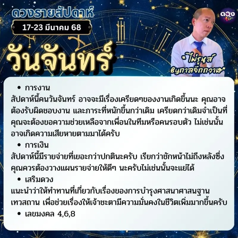 - การงาน: สัปดาห์นี้คนวันจันทร์อาจจะมีเรื่องเครียดๆ ของงานเกิดขึ้นนะ คุณอาจต้องรับผิดชอบงานและภาระที่หนักขึ้นกว่าเดิม เครียดกว่าเดิมจำเป็นที่คุณจะต้องขอความช่วยเหลือจากเพื่อนในทีมหรือคนรอบตัว ไม่เช่นนั้นอาจเกิดความเสียหายตามมาได้ครับ