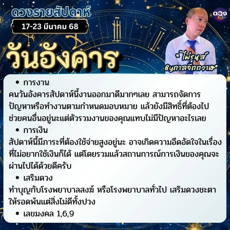 - การงาน: คนวันอังคารสัปดาห์นี้งานออกมาดีมากๆ เลย สามารถจัดการปัญหาหรือทำงานตามกำหนดมอบหมาย แล้วยังมีสิทธิ์ที่ต้องไปช่วยคนอื่นอยู่นะแต่ตัวรวมงานของคุณแทบไม่มีปัญหาอะไรเลย