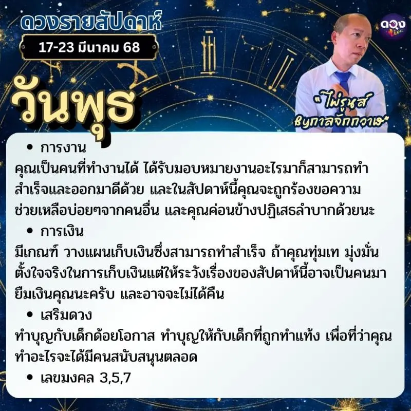 - การงาน: สัปดาห์นี้ระวังนะ เรื่องความใจร้อน และอย่าหลงลืมว่าเราต้องทำงานร่วมกับคนอื่น ห้ามใช้ความคิดตัวเองเป็นใหญ่เพราะจะรับปัญหาตามมาแน่ๆ
