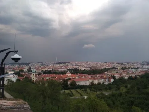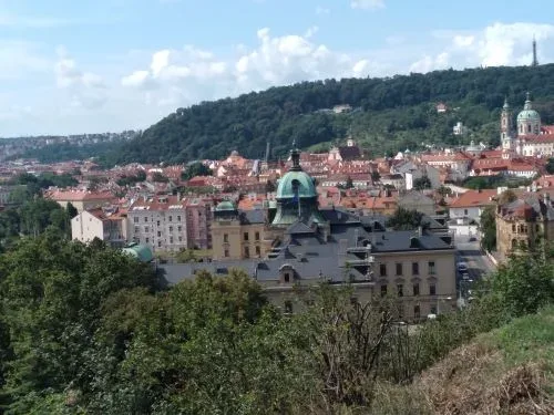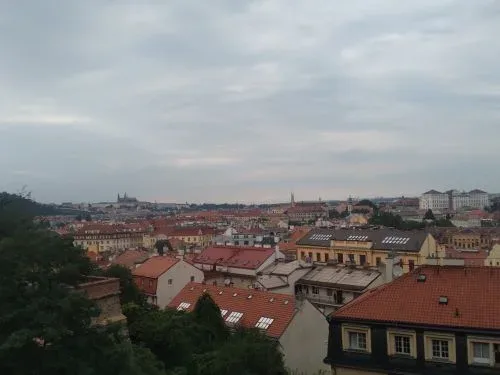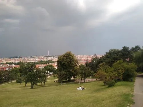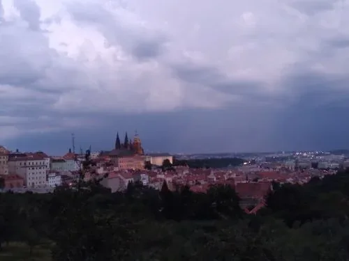 จากที่เคยเดินสวยๆ เข้าชม Prague Castle เห็นปราสาทตั้งตระหง่านตรงหน้า คราวนี้เพื่อนเจ้าบ้านพาเดินลัดเลาะไปมา เดินขึ้นเนินมาเรื่อยๆ เหนื่อยหอบไม่ใช่เล่น อย่างไรก็ไม่รู้ มาโผล่เป็นสวนต้นไม้ครึ้ม มีทางเดินเล่นเล็กๆ กลับหลังมอง อ่าว!...เป็นวิวกรุงปรากสวยงาม รับกับแดดอ่อนยามเย็น มีคนมานั่งปิ๊กนิ๊ก วิ่งออกกำลัง นั่งดื่ม ตั้งวงพูดคุยให้ดูเพลินๆ เราดูวิวปราสาทจากด้านหลังจนพระอาทิตย์ตกดิน จนค่ำ จนฟ้ามืด เพื่อนก็พาเดินวกไปมาจนเข้าเมือง