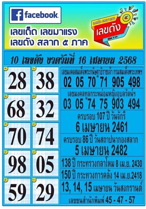 10 เลขเด็ดเลขดัง "สลาก 5 ภาค" งวดวันที่ 16 เมษายน 68..อยากรวย รีบส่องเลย!!