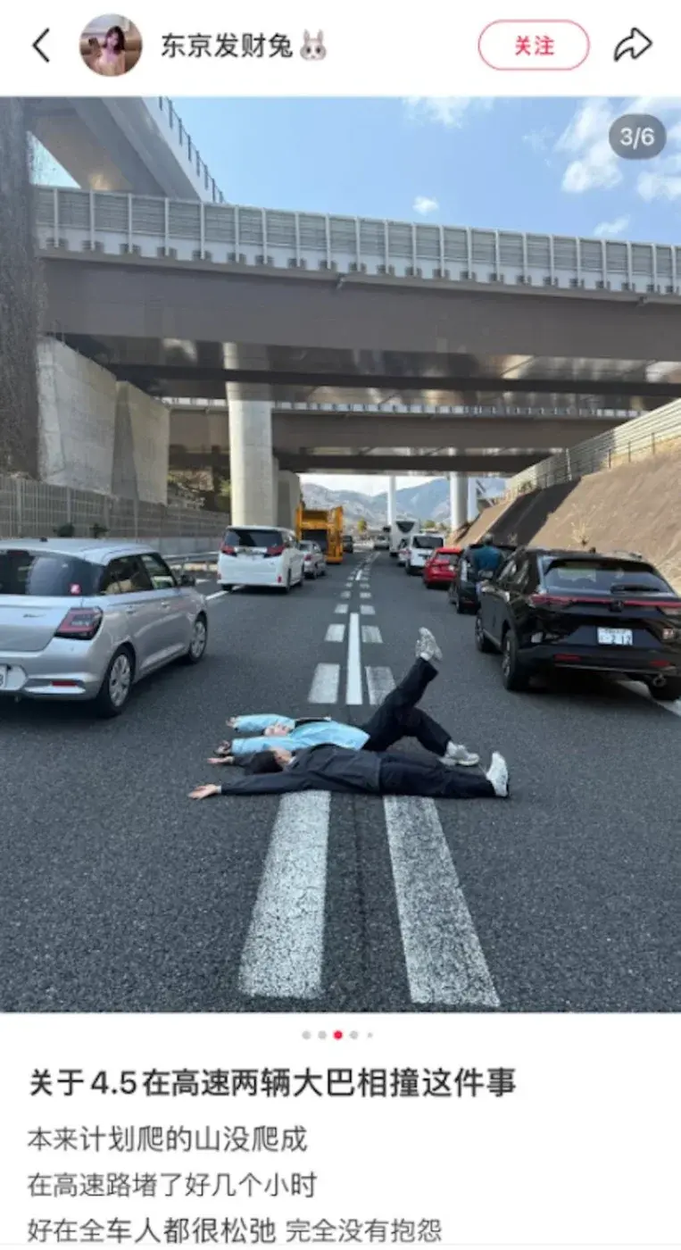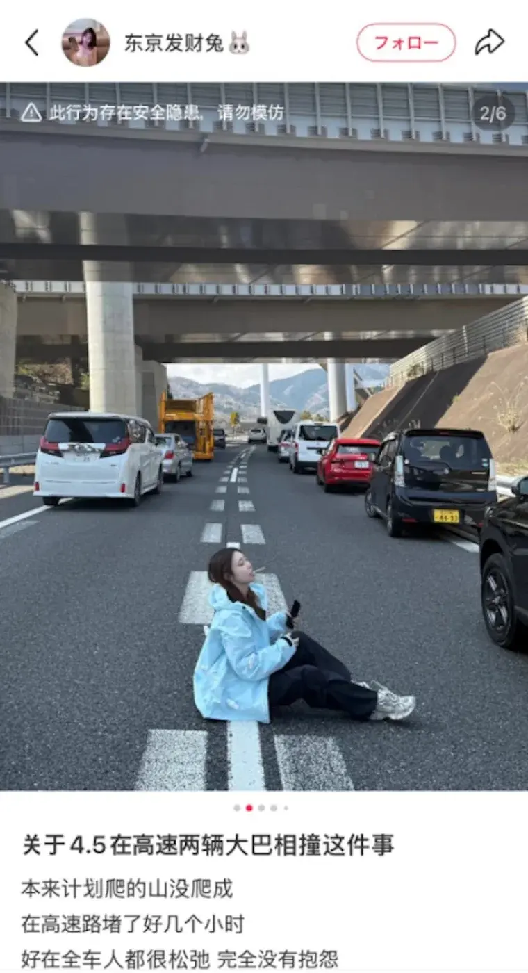 เมื่อวันเสาร์ที่ผ่านมา (5 มี.ค.)เวลาประมาณ 10.15 น.เวลานั้นถนนมีการจราจรคับคั่ง รถบัสท่องเที่ยวคันหน้าได้ชะลอความเร็วลง คนขับรถบัสที่ขับรถตามหลังไม่ทันสังเกตว่ารถบัสคันหน้าเบรกแตกจึงพุ่งชนเข้าอย่างจัง บริเวณทางเข้าอุโมงค์โคบุตสึบนช่องทางเดินรถฝั่งขาลงของทางด่วนชูโอในเมืองฮาจิโอจิ โตเกียว ประเทศญี่ปุ่น ทำให้การจราจรติดขัด ได้มีนักท่องเที่ยวหญิงชาวจีนได้เดินลงมาที่ถนนและนอนบนทางหลวงเพื่อถ่ายรูปและเช็คอินระหว่างที่การจราจรติดขัด พฤติกรรมของหญิงคนนี้ก่อให้เกิดการถกเถียง และหลายๆ คนส่งต่อภาพดังกล่าวบนโซเชียลมีเดียและวิจารณ์เธอ สื่อญี่ปุ่นบางแห่งส่งต่อภาพถ่ายดังกล่าวและเตือนว่าเธอได้ละเมิดมาตรา 76 ของกฎหมายจราจรทางบก ซึ่งห้ามนอนบนถนนและอาจถูกปรับเป็นเงินไม่เกิน 50,000 เยน (ประมาณ 12,000 บาท) ตอนนี้ผู้หญิงคนนั้นได้ลบบันทึกที่เกี่ยวข้องแล้ว