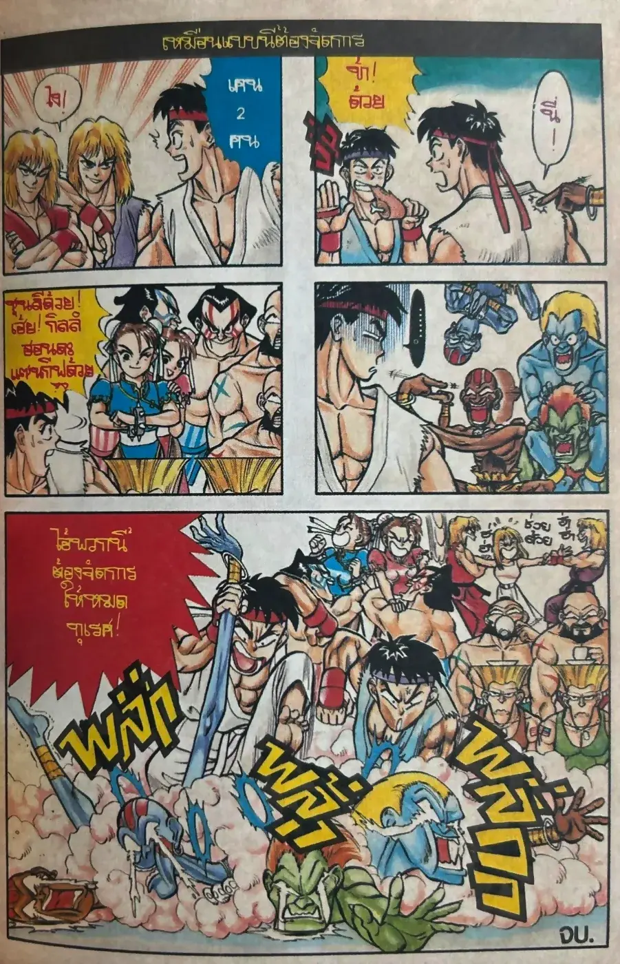 ย้อนกลับไปเมื่อราวๆ ปี 1991 ในตอนนั้นถ้าใครเกิดทันหรืออยู่ใยวงการเกมมานานพอน่าจะรู้ว่าสมัยนั้นเกม Street Fighter 2 โด่งดังมากๆ ชนิดที่ว่านอกจากเกมแล้วก็ยังมีภาพยนตร์ของเล่นของสะสมไปจนถึงสมุดสูตรเกมที่เกี่ยวกับ Street Fighter 2 ออกมามากมายให้เด็กยุคนั้นได้หามาสะสม และหนึ่งในสิ่งที่ขาดไปไม่ได้ของหนังสือสูตรเกมยุคนั้นคือการ์ตูน 4 ช่องจบทางนักเขียนญี่ปุ่นมักจะวาดขึ้นมาโดยเป็นมุกจากเกม Street Fighter 2 แบบต่างๆ มาลง ซึ่งทางหนังสือเกมบ้านเราก็แปลเอามาลงให้ได้อ่าน จนล่าสุดระหว่างที่ผู้เขียนกำลังท่อง FaceBook อยู่ก็เจอเพื่อนคนหนึ่งแชร์การ์ตูน 4 ช่องจบมา ที่ทางต้นทางบอกว่าถ่ายจากหนังสือการ์ตูนเกม Street Fighter 2 ของสำนักพิมพ์ Animated ที่วางจำหน่าย ปี 1993 เห็นว่ามันน่าสนใจดีเลยเอามาลงให้ได้อ่านกัน ซึ่งต้องขออนุญาตเพจ Retrogame2you ที่ยืมรูปมาด้วย มาดูกันว่ามีมุกอะไรน่าสนใจบ้าง