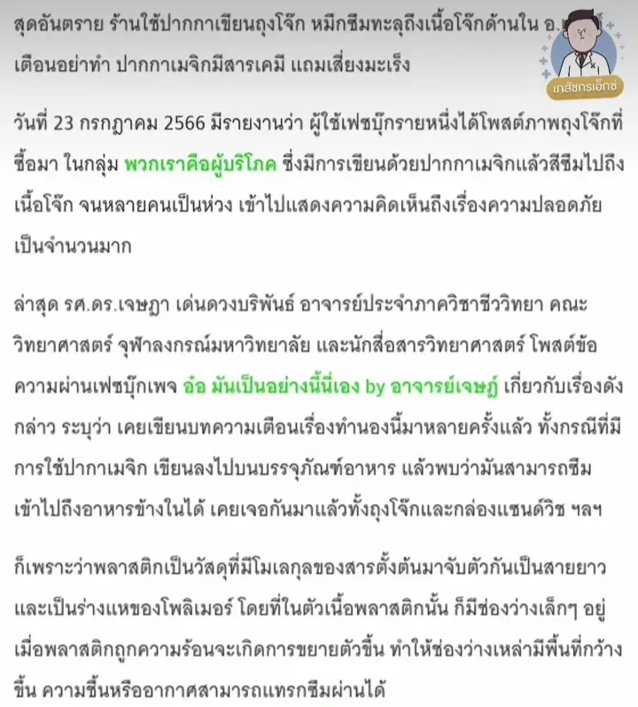 เวลาไปซื้ออาหารแล้วก็มีการใส่ถุง แล้วทางร้านก็จะเขียนด้วยปากกาเมจิกเราต้องไม่ให้เขาเขียนปากกาเมจิกลงถุงอาหารเด็ดขาด ถ้าเกิดเจอแบบนี้ต้องหลีกเลี่ยง สีของปากกาเมจิกหากเข้าสู่ร่างกายของเรามันมีโทษและเกี่ยวกับการเกิดมะเร็งอย่างแน่นอน..