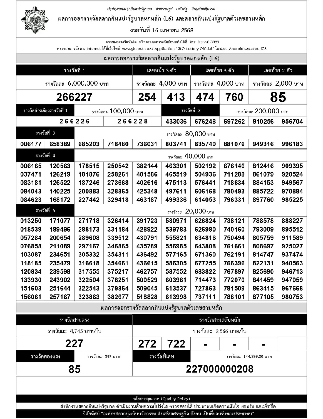 รางวัลละ 6,000,000 บาท เลขที่ออก 266227