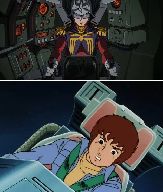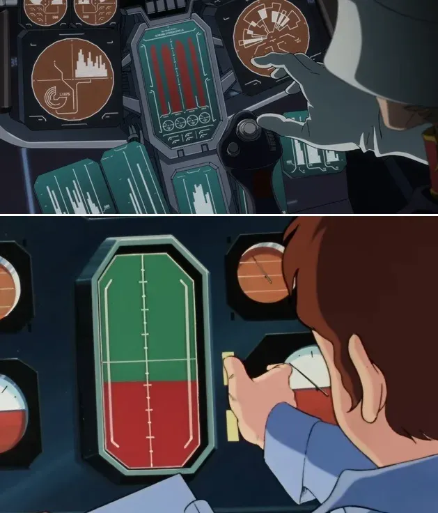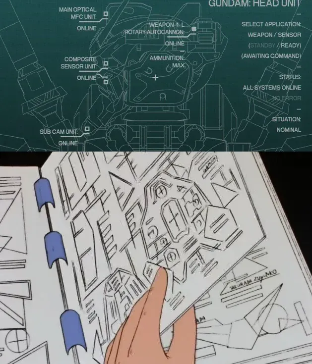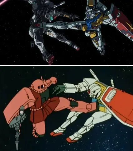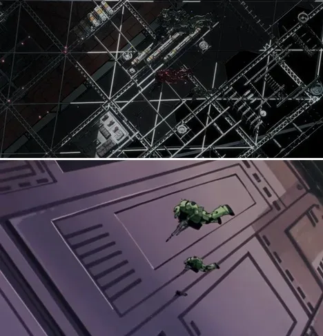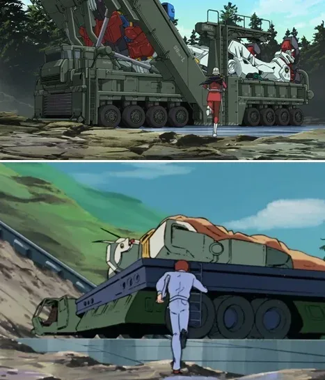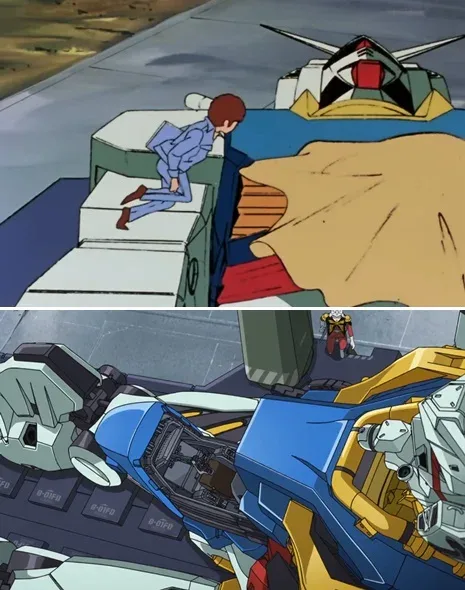 ต่อมาึือฉากที่ชาร์วิ่งไปที่ Gundam ส่วนภาพล่างคือตอนที่อามุโร่วิ่งไปที่ Gundam มุมเดียวกันเป๊ะ