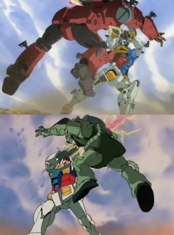 ปิดท้ายคือท่าถีบในตำนานที่แฟน ๆ Mobile Suit Gundam จำได้ดีแค่เปลี่ยนหุ่นที่ถีบกับถูกถีบแต่คนขับหุ่นคือนเดียวกัน ซึ่งฉากนี้คือตอนที่ชาร์ปรากฏตัวครั้งแรก เพราะเขาอยู่ในยานไม่ได้ลงไปในโคโลนี่ ซึ่งนี่เป็นแค่บางส่วนเท่านั้นถ้าใครที่เป็นแฟน Mobile Suit Gundam บอกเลยว่าฟินแน่นอนสำหรับตอนนี้