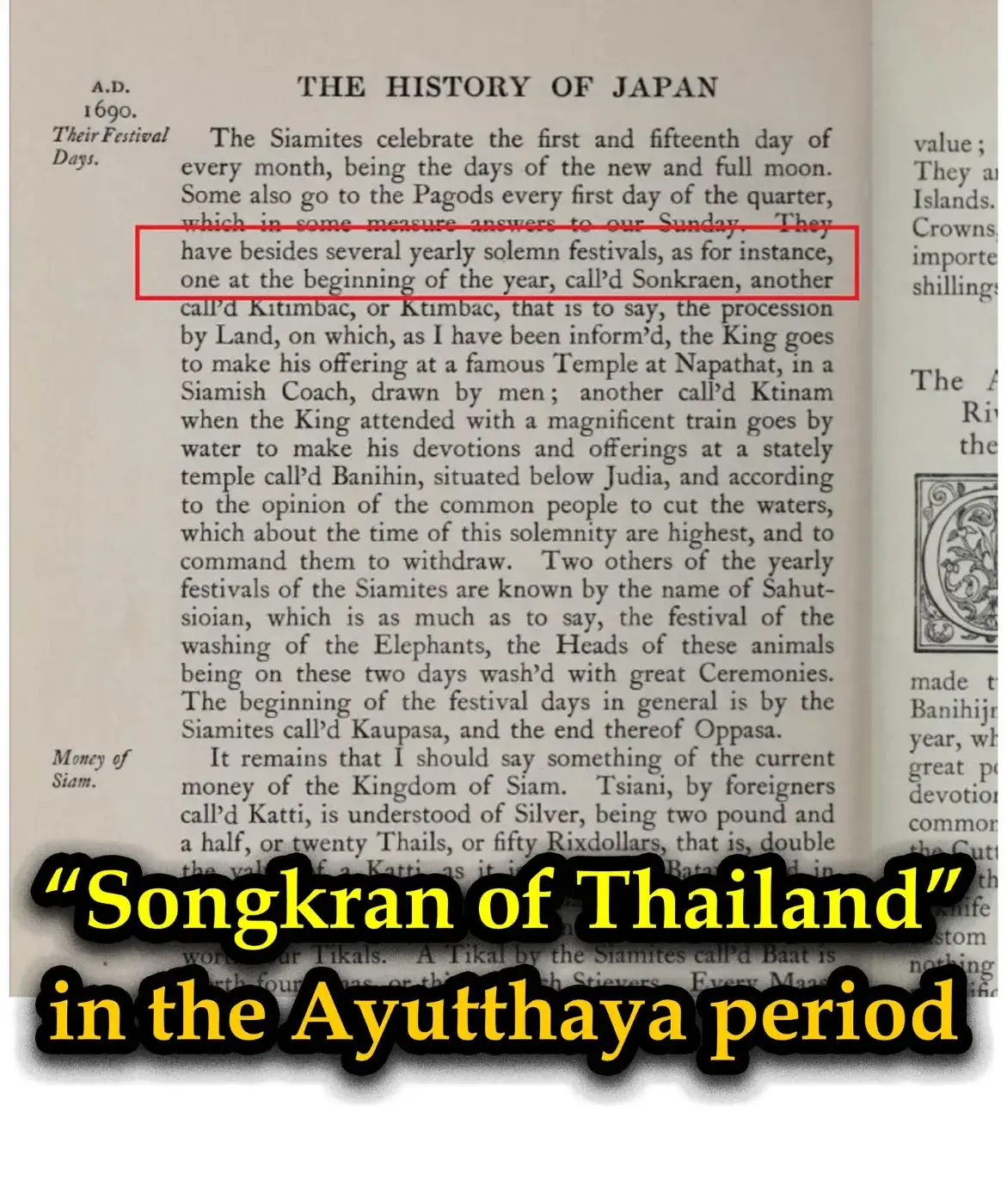 หนังสือเล่มนี้เป็นหนังสือบันทึกของชาวดัตช์ ซึ่งเนื้อหาหลักจะเกี่ยวกับประวัติศาสตร์ญี่ปุ่น แต่ผู้เขียนหรือผู้บันทึกได้แวะที่กรุงศรีอยุธยาก่อนเดินทางไปญี่ปุ่น บันทึกดังกล่าวมีเรื่องราวเกี่ยวกับกรุงศรีอยุธยาด้วย หนังสือระบุถึงเทศกาลหนึ่งของชาวกรุงศรีอยุธยาไว้ว่า "...They have besides several yearly solemn festivals, as for instance, one at the beginning of the year, call'd Sonkraen, .....