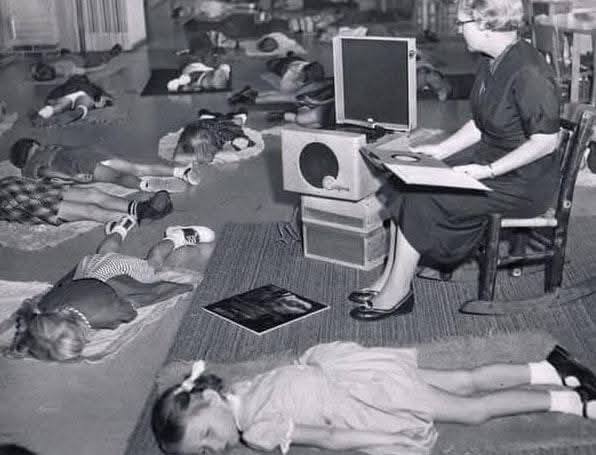 ในช่วงยุค 1950s การให้นักเรียนอนุบาลได้นอนกลางวันถือเป็นสิ่งจำเป็นอย่างยิ่ง คุณครูและนักการศึกษาสมัยนั้นเชื่อมั่นว่า การพักผ่อนหลังมื้อกลางวันมีผลต่อการเจริญเติบโตและพัฒนาการของเด็กโดยตรง หลังอาหารกลางวันเสร็จสิ้น เด็กๆ ทุกคนจะต้องเตรียมตัวขึ้นเสื่อหรือนอนบนเตียงเล็กที่จัดไว้ในห้องเรียนที่ออกแบบมาโดยเฉพาะสำหรับช่วงเวลานี้