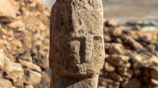 เสาหินแกะสลักใบหน้ามนุษย์อายุประมาณ 12,000 ปี ที่โบราณสถานคาราฮาน เทเป ในเมืองซานลีอูร์ฟา ประเทศตุรกี