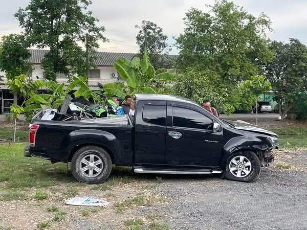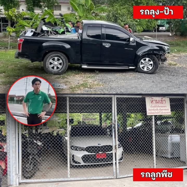 ขณะเดียวกัน รถกระบะของลุงป้า ซึ่งเป็นคู่กรณีในเหตุการณ์ ถูกนำมาจอดไว้บริเวณลานจอดรถด้านหลัง สภาพรถมีความเสียหายชัดเจน ทั้งกระจกหน้าแตก ยางล้อขวาแตก และแม็กซ์ล้อเบี้ยว โดยจอดอยู่ในพื้นที่กลางแจ้ง ไม่มีหลังคาคลุม