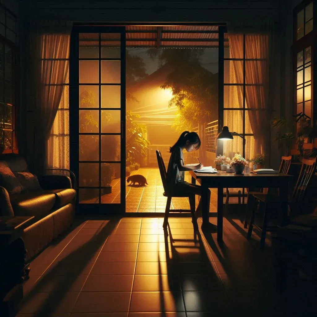 น้องเข้านอนไปแล้ว ส่วนฉันยังไม่นอน เพราะต้องนั่งทำการบ้านอยู่ที่ห้องโถงกลางบ้าน ซึ่งเป็นพื้นที่เปิดโล่ง ด้านหน้าบ้านเป็นประตูกระจกบานใหญ่ที่มองเห็นภายนอกได้ชัดเจน