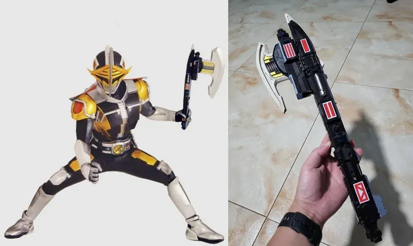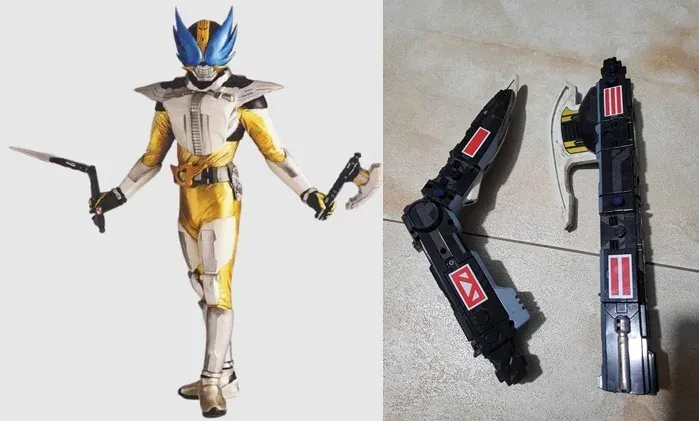 เริ่มจากตัวอาวุธที่จะแยกเป็น 4 ชิ้นที่จะติดอยู่ตรงด้านข้างเข็มขัดของพระเอกที่มรหมายเลข 1 ถึง 4 บอกเอาไว้