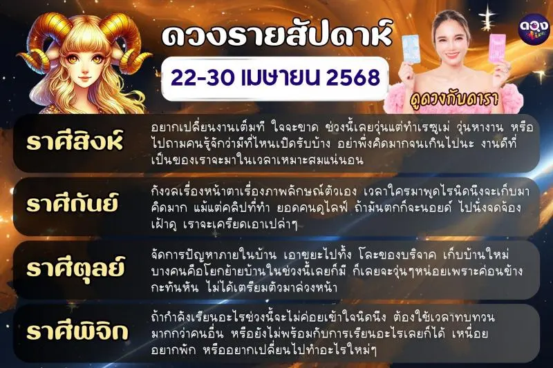 ดวงรายสัปดาห์ 12 ราศี ประจำวันที่ 22 – 30 เมษายน 2568 ดูดวงกับดารา