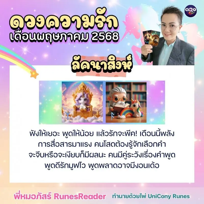 🔮ลัคนาสิงห์ : ฟังให้เยอะ พูดให้น้อย แล้วรักจะพีค! เดือนนี้พลังการสื่อสารมาแรง คนโสดต้องรู้จักเลือกคำ จะจีบหรือจะเงียบก็มีผลนะ คนมีคู่ระวังเรื่องคำพูด พูดดีรักมูฟไว พูดพลาดอาจมีงอนเด้อ