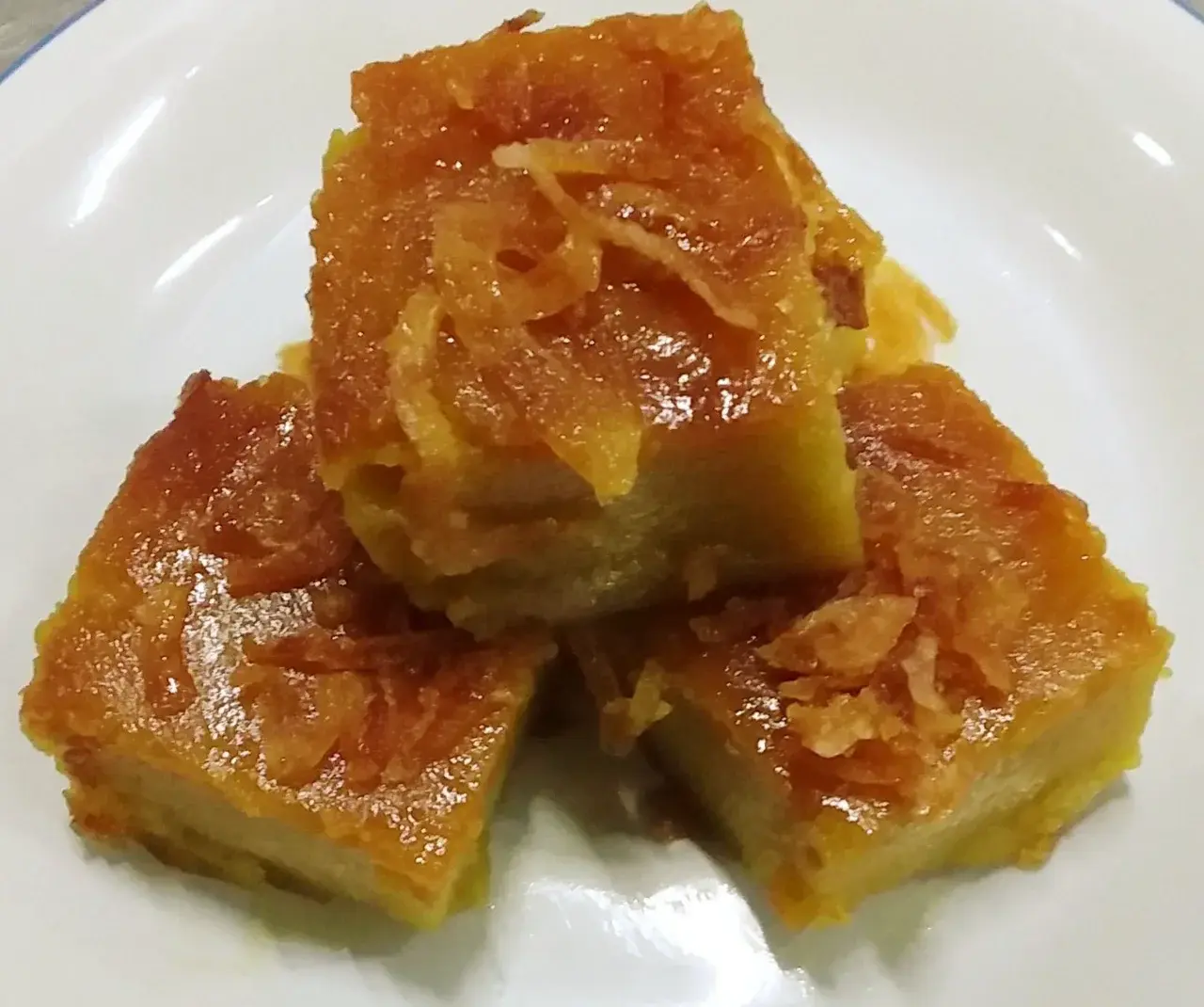 เทส่วนผสมลงในพิมพ์ที่ทาด้วยน้ำมันเล็กน้อย นำเข้าเตาอบที่อุณหภูมิ 180 องศาเซลเซียส ประมาณ 45 นาที หรือจนขนมสุก หน้าขนมสีเหลืองทอง
