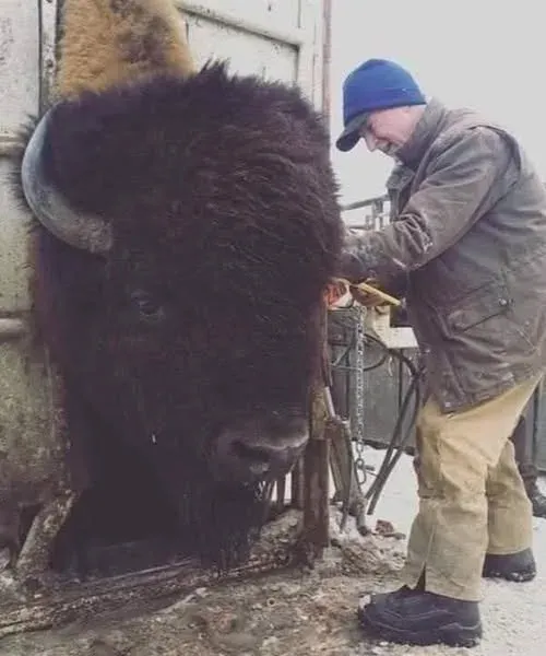 สัตว์ขนาดมหึมาตัวนี้คือวัวไบซันอเมริกัน และภาพที่คุณเห็นคือสัตวแพทย์กำลังเก็บตัวอย่างเลือดจากมัน หากอยากตระหนักถึงขนาดอันน่าเหลือเชื่อของมันจริงๆ ให้ลองสังเกตเพียงแค่ส่วนศีรษะ ที่ใหญ่กว่าตัวของสัตวแพทย์ซึ่งยืนอยู่ข้างๆ — และที่สำคัญ เขาคนนั้นสูงกว่า 6 ฟุต (ราว 183 เซนติเมตร) เลยทีเดียว!
