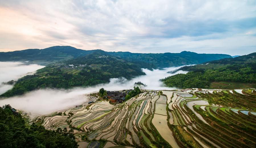 กลางผืนป่าธรรมชาติสีเขียวชอุ่มของอำเภอฉงเจียง มณฑลกุ้ยโจว ทางตะวันตกเฉียงใต้ของจีน ปรากฏทัศนียภาพอันน่าตื่นตาตื่นใจของ “นาขั้นบันได” ที่ทอดตัวเรียงรายเป็นชั้นๆ โอบล้อมด้วยเทือกเขาและป่าผืนใหญ่ สะท้อนให้เห็นถึงการอยู่ร่วมกันระหว่างธรรมชาติกับวิถีชีวิตของมนุษย์อย่างกลมกลืน