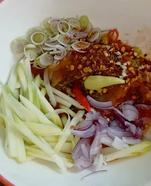 ใส่มะม่วงซอยตามลงไปพร้อมหอมแดง คนให้ทุกอย่างเข้ากัน แต่ต้องเบามือนะครับ อย่ารุนแรงกับปลามาก เดี๋ยวเขาจะน้อยใจ