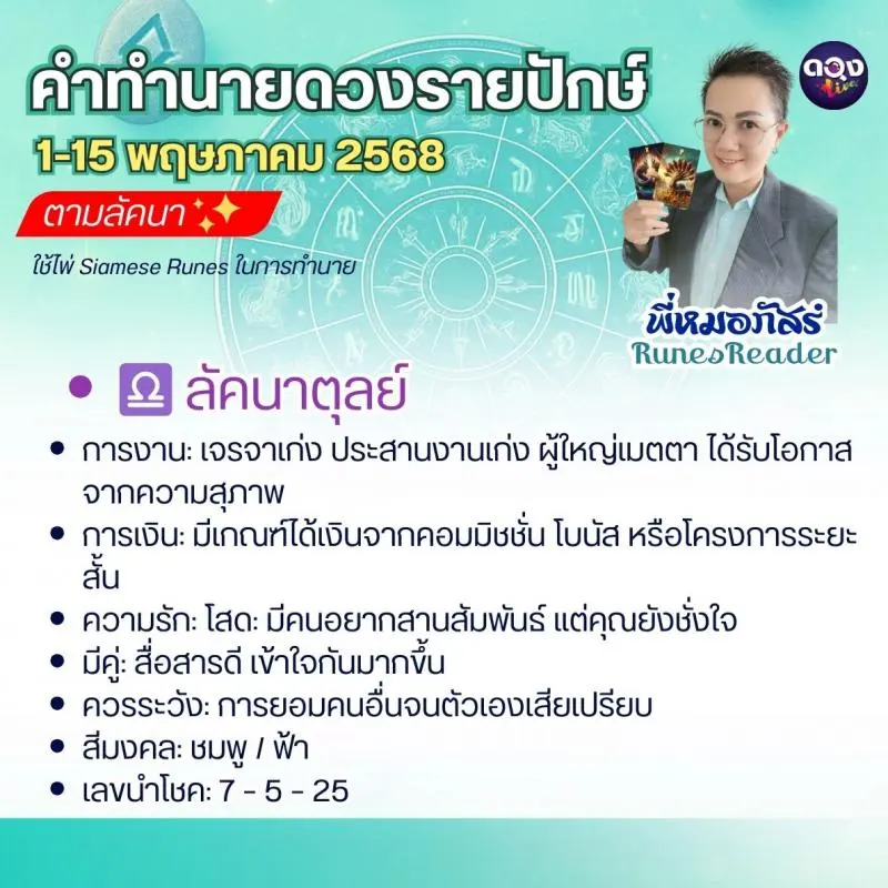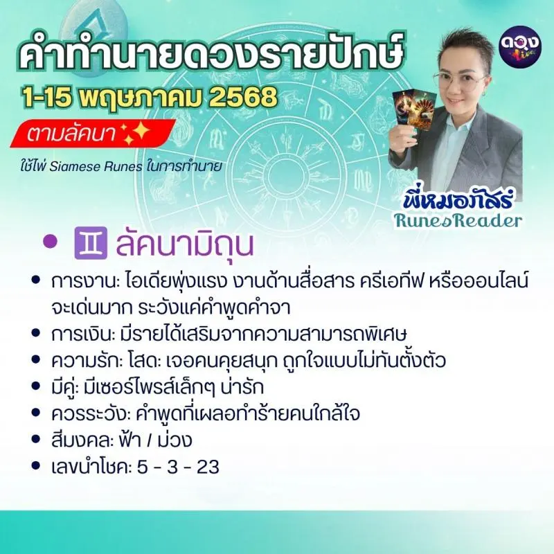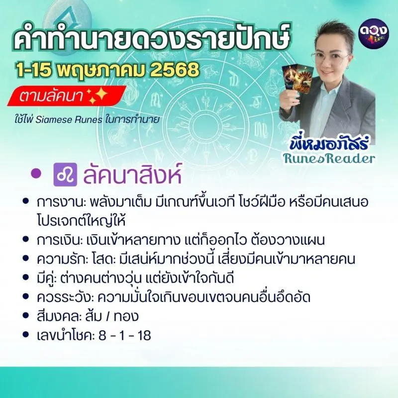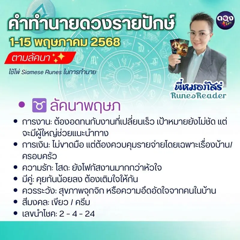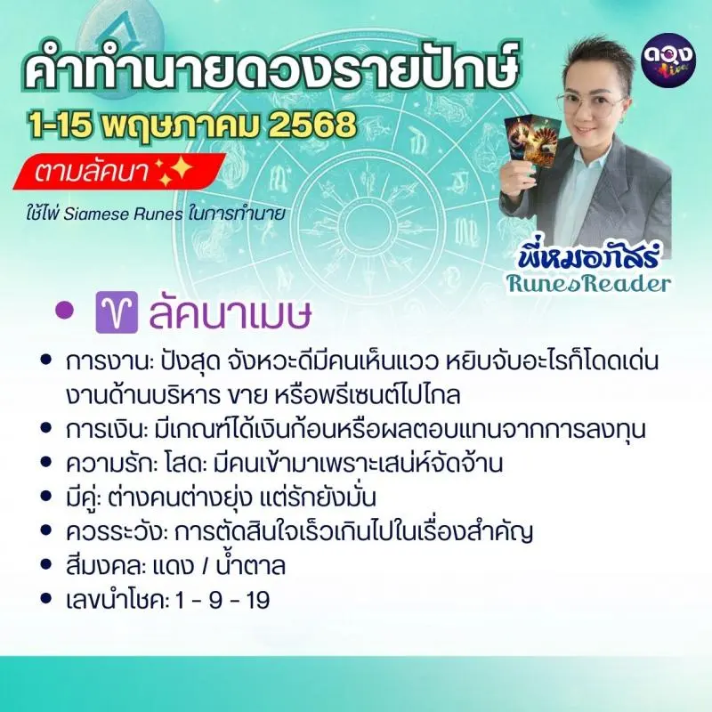 คำทำนายดวงรายปักษ์ 1-15 พฤษภาคม 2568 ตามลัคนา by พี่หมอภัสร์ Runes Reader ใช้ไพ่ Siamese Runes ในการทำนาย