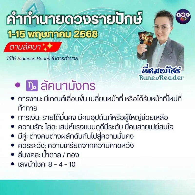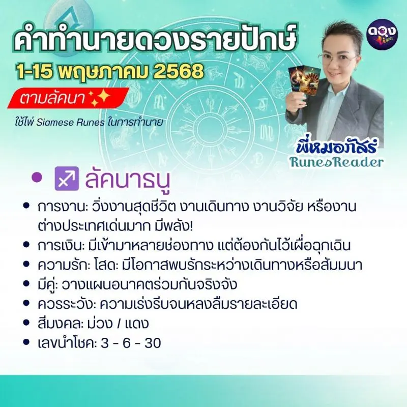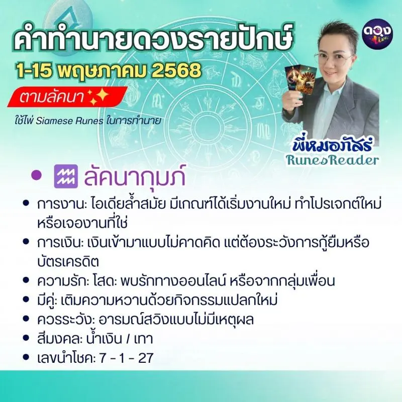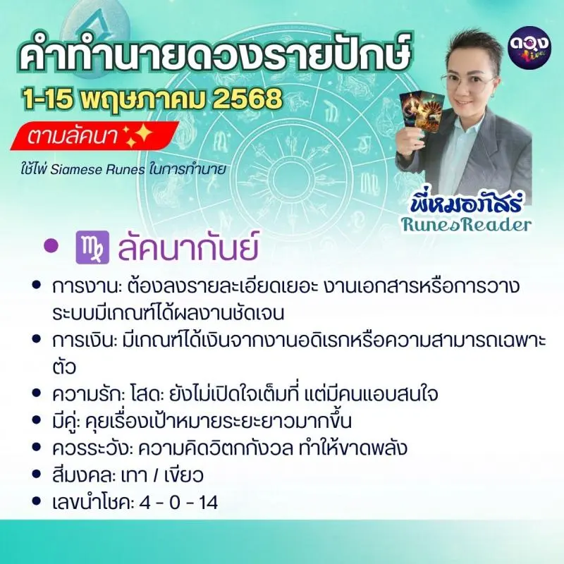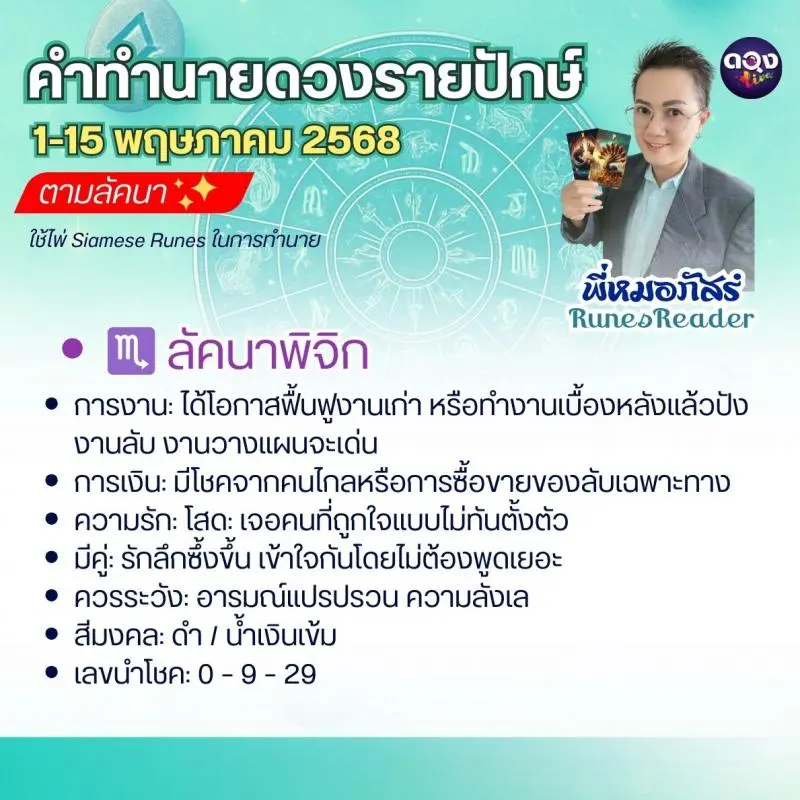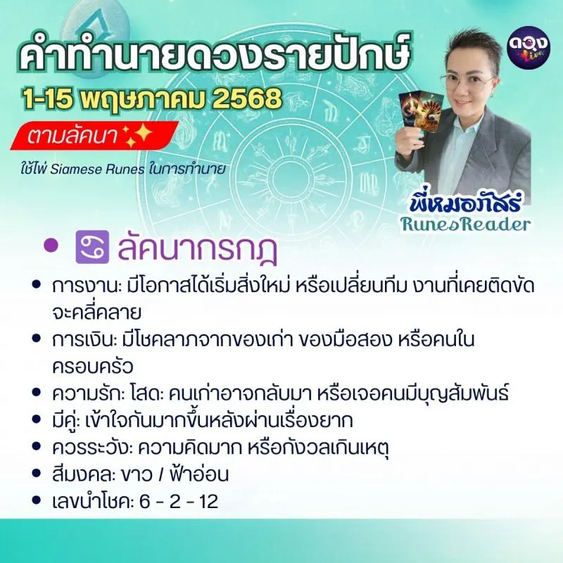 คำทำนายดวงรายปักษ์ 1-15 พฤษภาคม 2568 ตามลัคนา by พี่หมอภัสร์ Runes Reader ใช้ไพ่ Siamese Runes ในการทำนาย