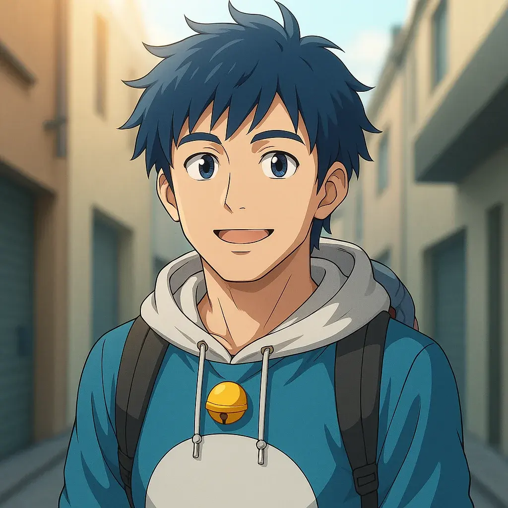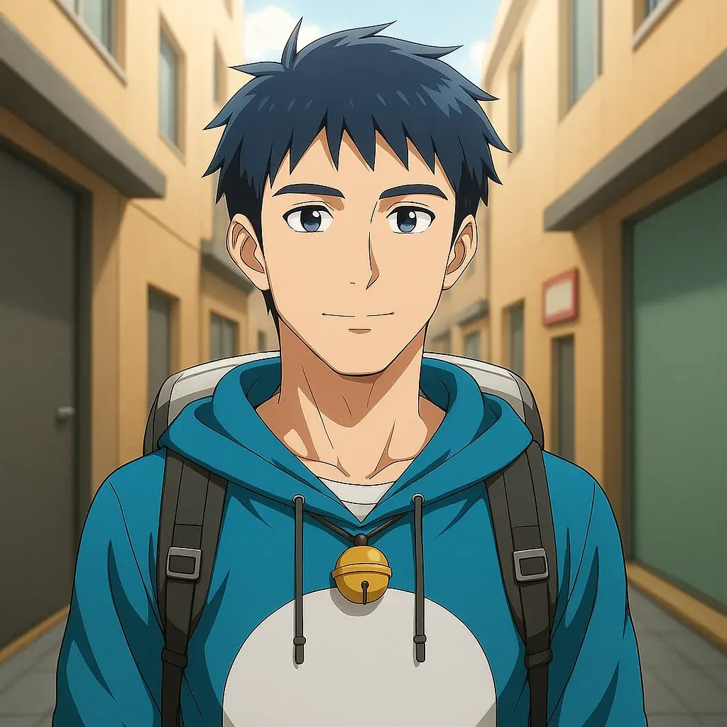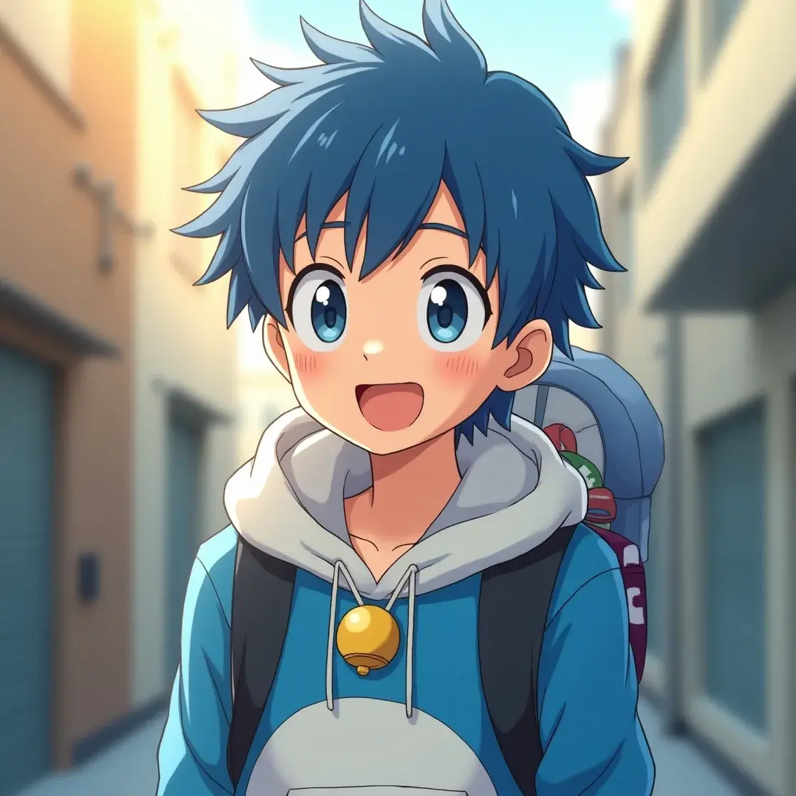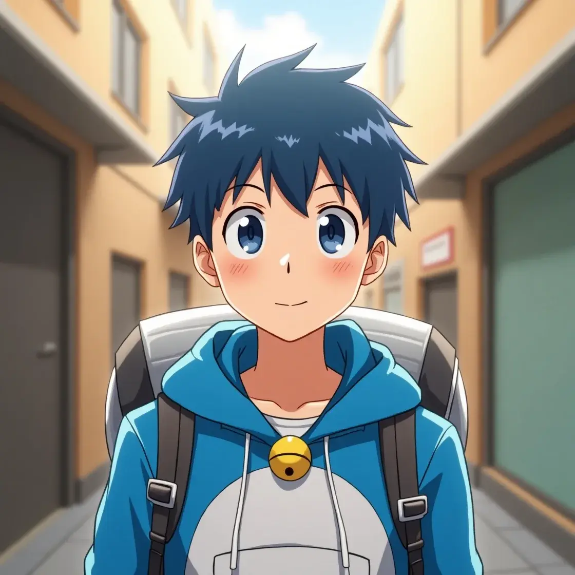 ลองจินตนาการดูสิ ถ้าเพื่อนหุ่นยนต์จากโลกอนาคตที่เรารักกันมาตลอด กลายเป็นมนุษย์จริงๆ จะเป็นยังไง? นี่แหละ! โดราเอม่อนเวอร์ชันหนุ่มวัยรุ่นหน้าใส ใจดี สวมเสื้อฮู้ดสีฟ้าพร้อมกระดิ่งที่คอเป็นเอกลักษณ์ 🛎️ แถมสะพายเป้หลังเหมือนแบกกระเป๋าวิเศษติดตัวไว้ตลอดเวลา
