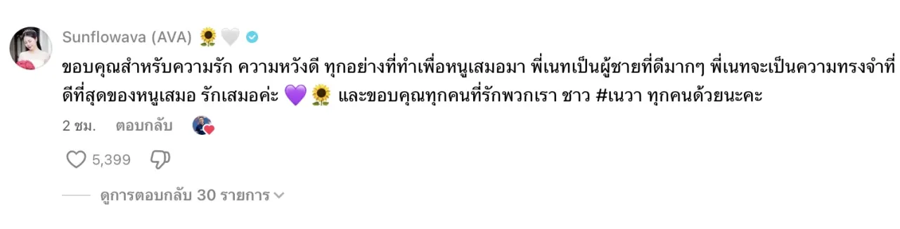 ต่อมาสาวเอวาได้มาตอบกลับข้อความว่า “ขอบคุณสำหรับความรัก ความหวังดี ทุกอย่างที่ทำเพื่อหนูเสมอมา พี่เนทเป็นผู้ชายที่ดีมากๆ พี่เนทจะเป็นความทรงจำที่ดีที่สุดของหนูเสมอ รักเสมอค่ะ 💜🌻 และขอบคุณทุกคนที่รักพวกเรา ชาว #เนวา ทุกคนด้วยนะคะ” ยังไงก็เป็นกำลังใจให้ทั้งคู่นะคะ