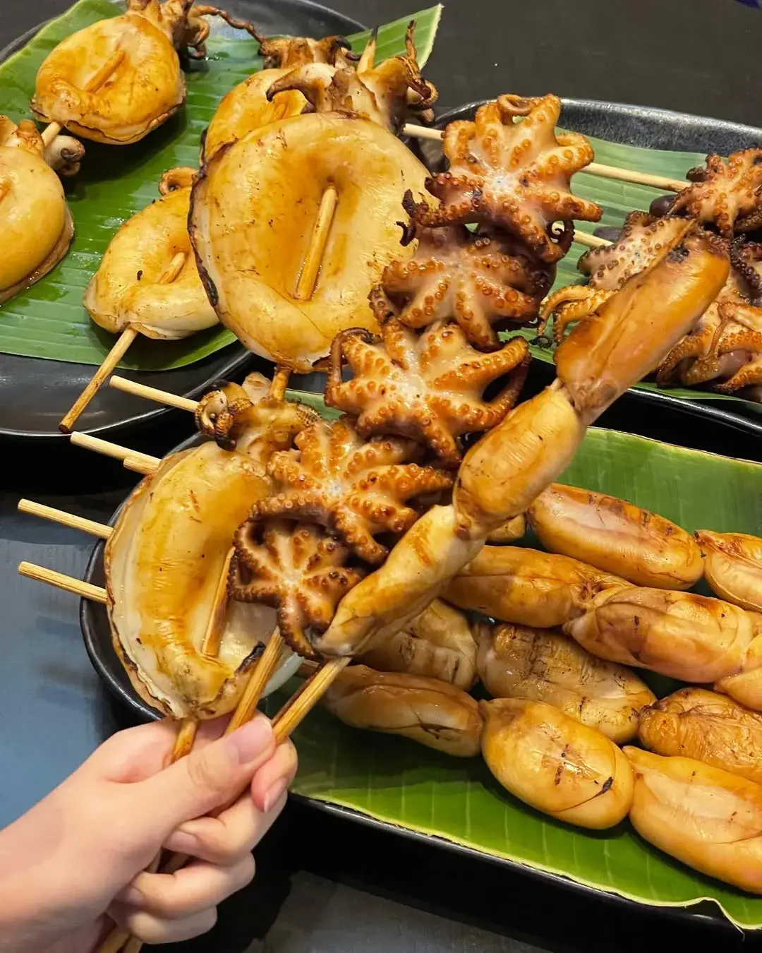 - โรยต้นหอม ผักชี เสิร์ฟพร้อมหมึกย่างหรืออาหารปิ้งอื่น ๆ