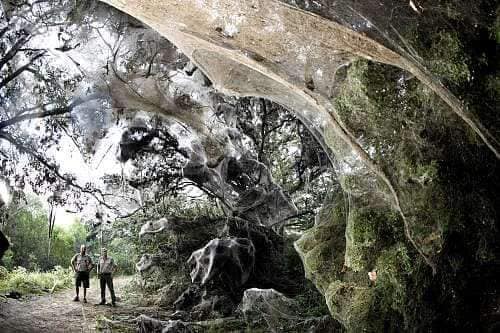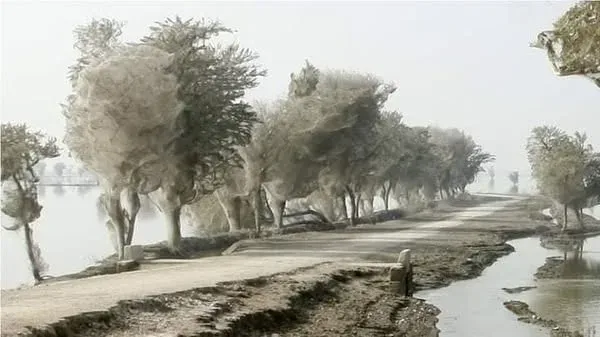 เส้นใยที่ปล่อยออกมาไม่ได้หายไปไหน แต่กลับเกาะตัวกันเป็นแผ่นใหญ่สีขาวปกคลุมพื้นที่กว้าง คล้ายพรมใยแมงมุมยักษ์ สร้างภาพที่น่าตื่นตะลึงราวกับฉากในหนังสยองขวัญ หรือเหมือนหิมะโปรยปรายในฤดูหนาว จนชาวบ้านบางคนอาจเข้าใจผิดไปจริงๆ ว่าหิมะตก