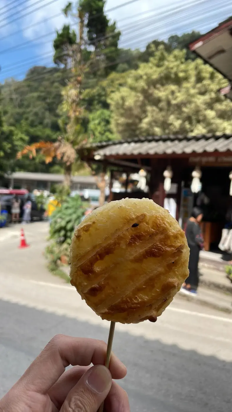 ก่อนจะหันกลับไป ก็เจอกับร้านเล็กๆ เป็นร้านบนรถเข็น มีเตาปิ้งควันลอยขึ้นมา กับแม่ค้าคนหนึ่งยืนอยู่ เลยเดินเข้าไป ได้กลิ่นหอมๆและก็พบกับข้าวจี่ ที่อยู่บนเตาร้อนๆเสียบไม้ พร้อมกับกล้วยปิ้ง เอาล่ะได้ของกินรองท้องแล้ว