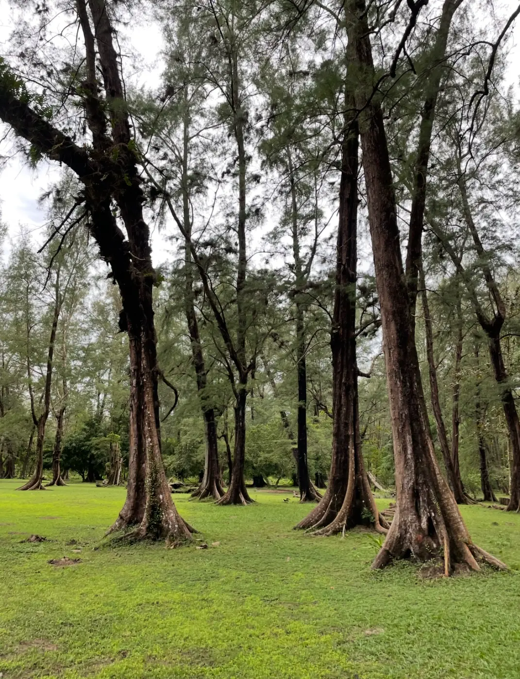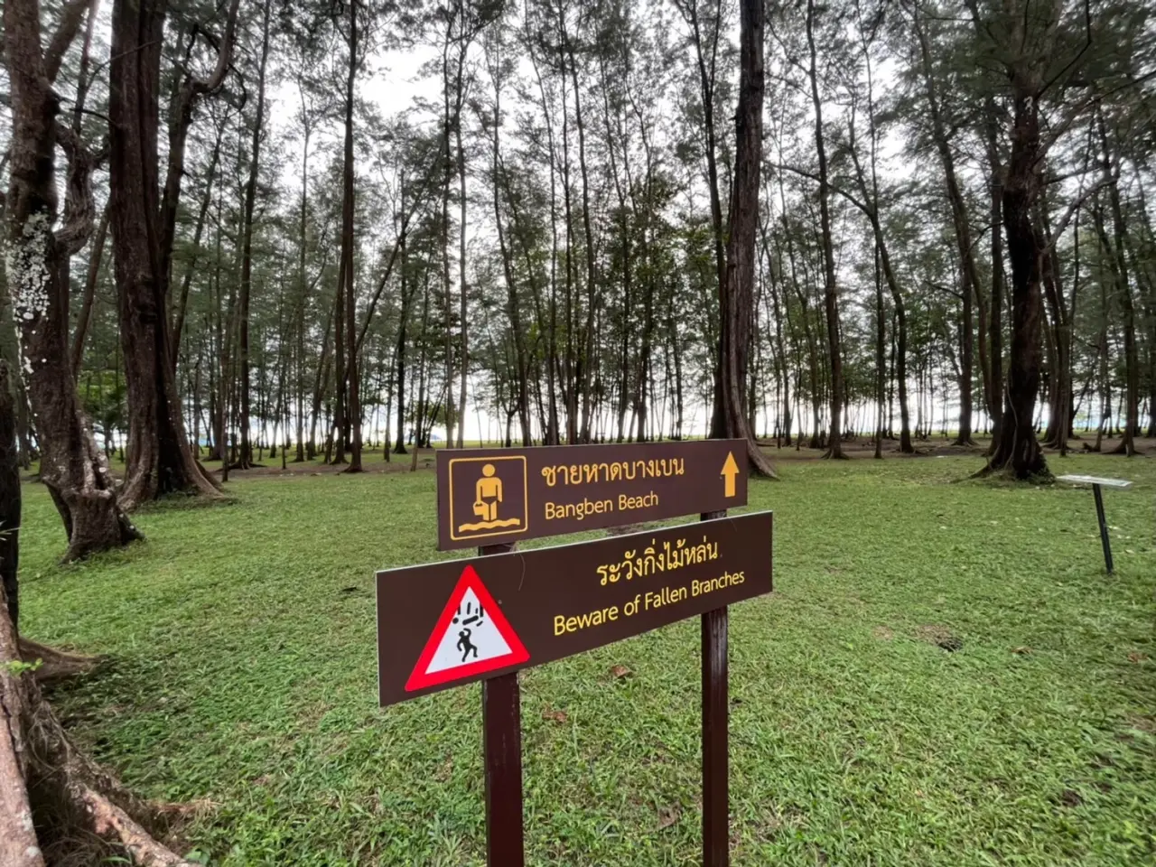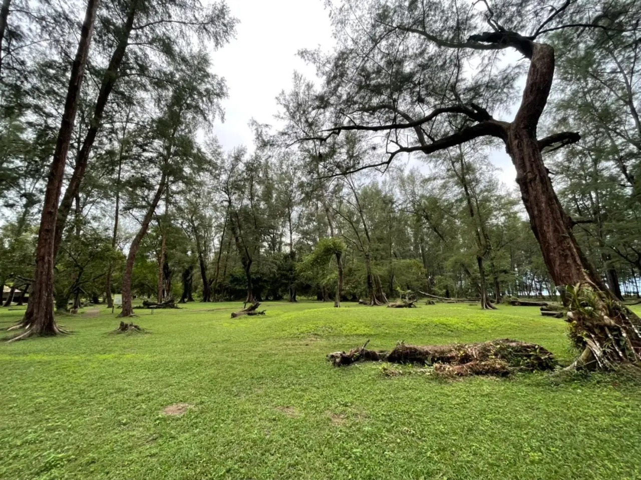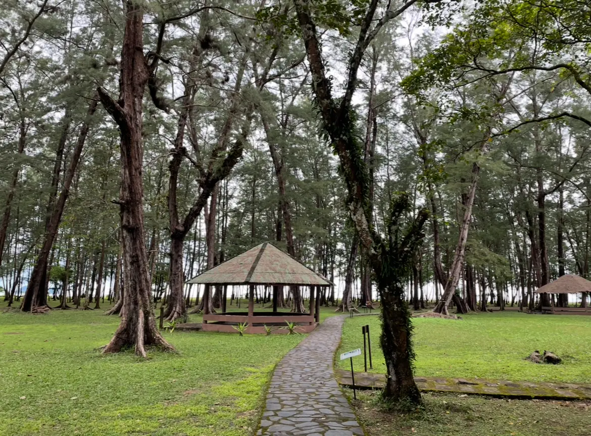 และก่อนจะเข้าสู่พื้นที่ชายหาด เราจะพบกับพื้นที่ป่าสนกว้าง ที่ให้ร่มเงา และพื้นหญ้าสีเขียว อยู่ก่อนจะถึงริมหาด ซึ่งทำให้บรรยากาศที่นั้นร่มรื่น แม้จะมีแดดร้อนก็ตาม เราก็เดินตามทางใต้ต้นสนแบบชิลล์ๆ ไม่ได้รู้สึกถึงความร้อนเลย ก่อนไปถึงหน้าหาด แนะนำให้หันหลังกลับไปมองในจุดที่เราเดินออกมา นั้นคือมุมต้นสนกับศาลาที่อยู่ตรงนั้น ช่างเข้ากันซะเหลือเกิน แล้วเราก็ได้ภาพสวยๆ สบายตาแบบนี้มา สวยมากก แค่ตอนนี้มองภาพก็มีความสุขแล้ว
