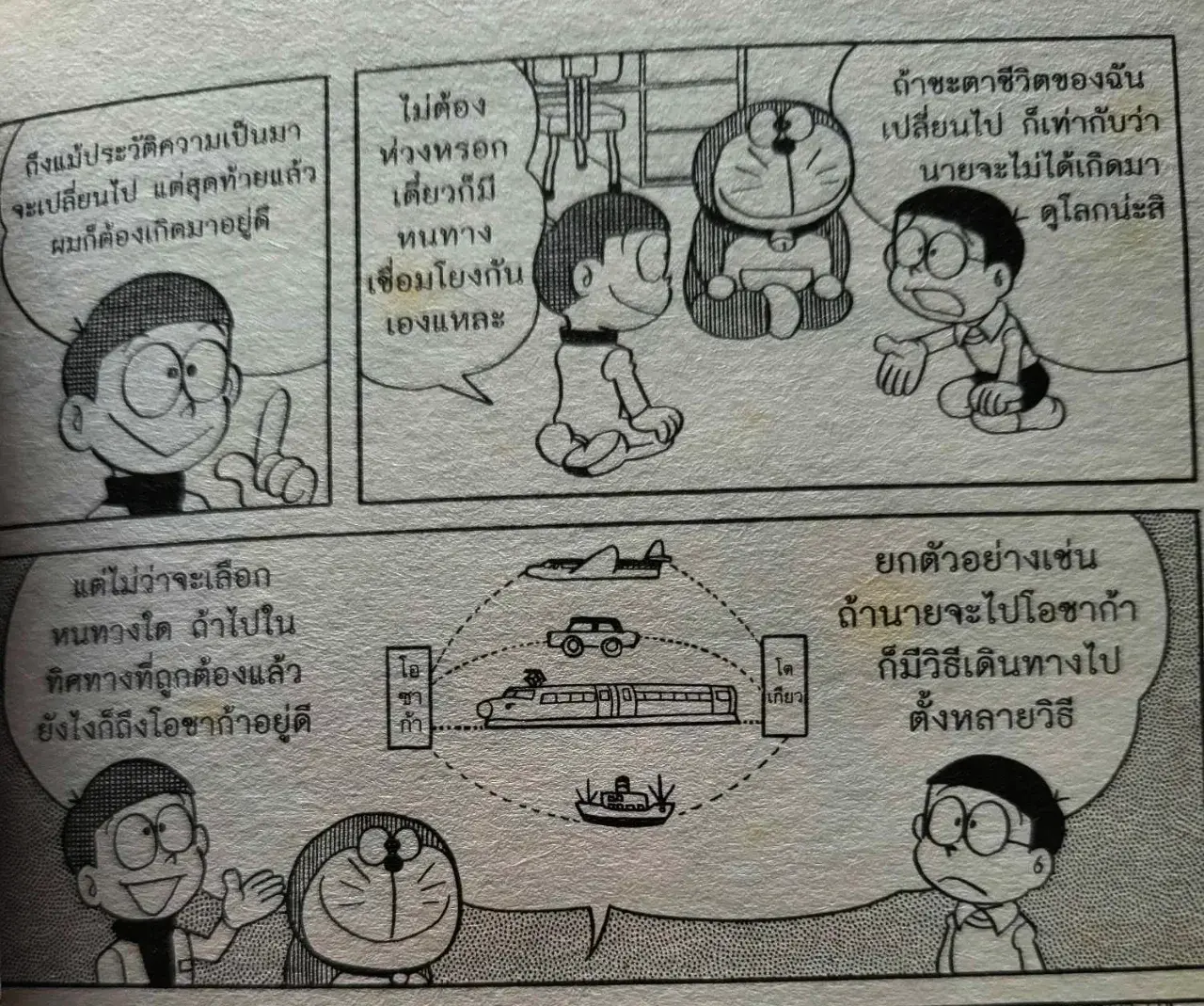 โดยคำตอบของคำถามนี้มาจากตอนแรกของ Doraemon เล่มที่ 1 เมื่อเซวาชิบอกกับโนบิตะว่าเขามาเปลี่ยนอดีตให้โนบิตะไปแต่งงานกับไจโกะ ทางโนบิตะก็ถามว่าถ้าเปลี่ยนแบบนั้นนายก็ไม่ได้เกิดซิ แต่เซวาชิตอบแบบเลี่ยงๆ ว่า "ไม่ต้องห่วงเดี๋ยวก็มีหนทางเชื่อมโยงกันเอง" แถมยังบอกโนบิตะอีกว่า "ถึงแม้ประวัติศาสตร์ความเป็นมาจะเปลี่ยนไป แต่สุดท้ายผมก็จะเกิดมาอยู่ดี" ทางโดราเอมอนก็อธิบายต่อว่า "ยกตัวอย่างนายที่จะเดินทางไปโอซาก้าก็มีวิธีเดินทางตั้งมากมายทั้งรถเรือเครื่องบิน ไม่ว่าจะเลือกทางไหน ถ้าไปในทิศทางที่ถูกต้องยังไงก็ถึงโอซาก้าอยู่ดี"