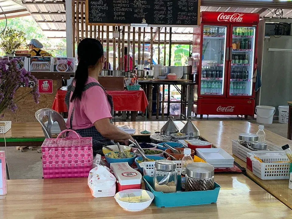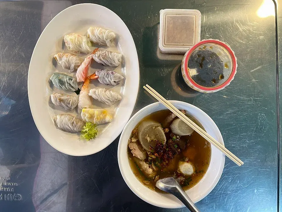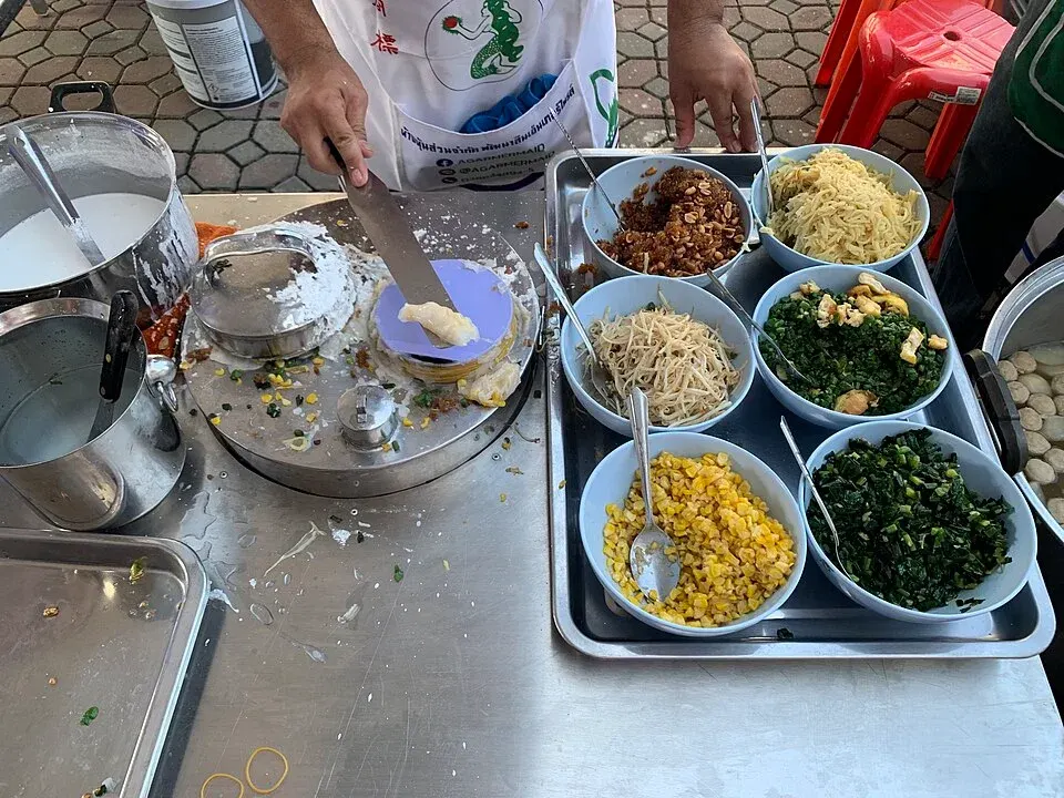 ก๋วยเตี๋ยวปากหม้อแบบแห้ง โรยหน้าด้วยหอมเจียว ในอำเภอบางปะอิน จังหวัดอยุธยา