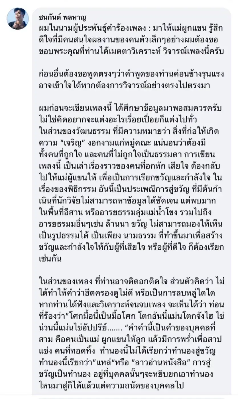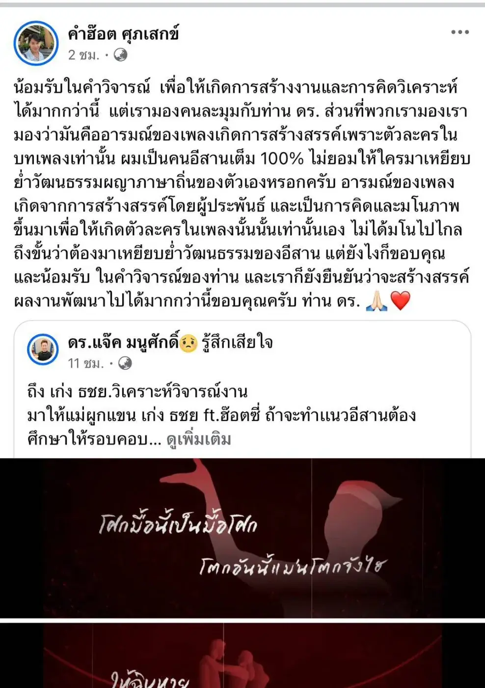 ไม่ทันข้ามคืน ชนกันต์ พลหาญ ผู้ประพันธ์เพลงนี้ก็ออกโรงสวนกลับแบบเผ็ดร้อน พร้อมทั้ง ฮ๊อตซี่ ศุภเสกข์ ก็ไม่ยอมเงียบ ออกมาชี้แจงผ่านเพจ “คำฮ๊อต ศุภเสกข์” ว่างานนี้เขาตั้งใจอย่างสุดหัวใจ สื่อความศรัทธาและความรักต่อวัฒนธรรมอีสานแบบร่วมสมัย ไม่ได้มาหยามหรือย่ำยีใด ๆ เลยเด้อ!
