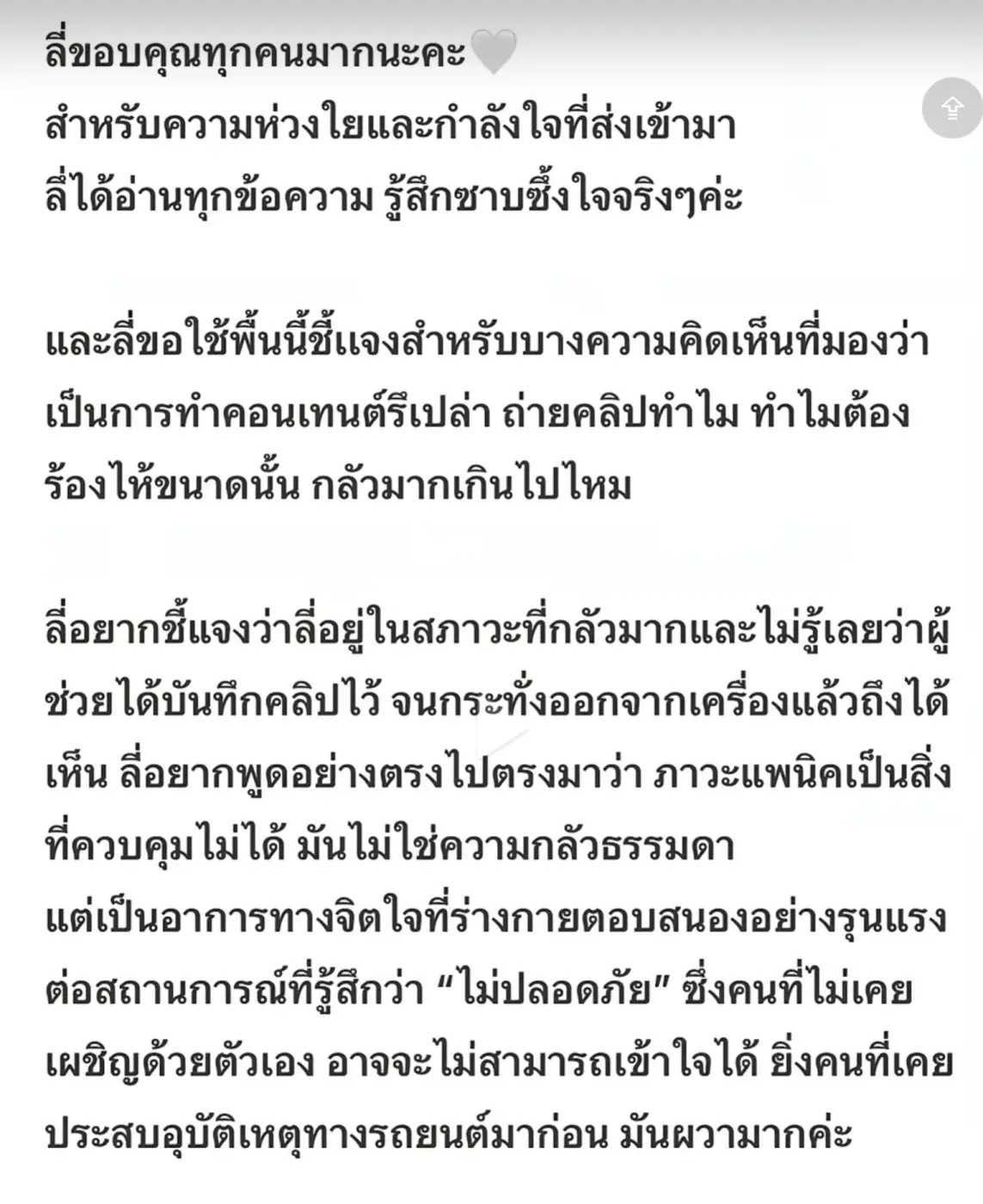 “ลิลลี่ ภัณฑิลา” ชี้แจ้งหลังมีดราม่าบอก “แพนิคแต่ทำไมยังถ่ายคลิปได้”