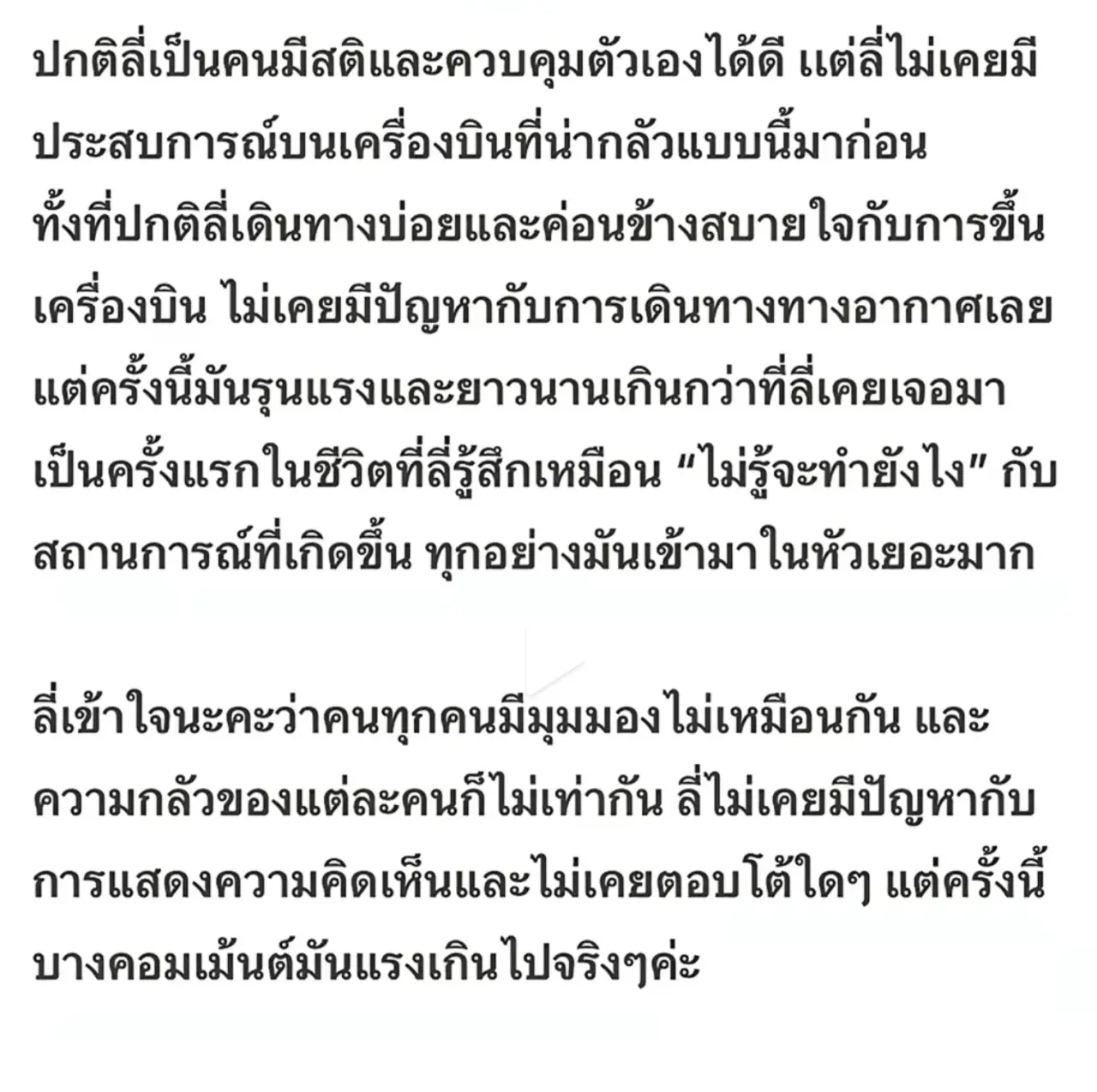 ล่าสุดเธอออกมาชี้แจงว่า เธอไม่ได้เป็นคนถ่าย ผู้ช่วยของเธอที่ถ่ายคลิปไว้ และเธอก็เพิ่งเห็นตอนลงจากเครื่องเเล้ว ภาวะแพนิคมันคุมไม่ได้ มันเป็นอาการทางจิตใจที่ร่ายกายตอบสนองอย่างรุนแรงต่อสถานการณ์ที่รู้สึกว่าไม่ปลอดภัย