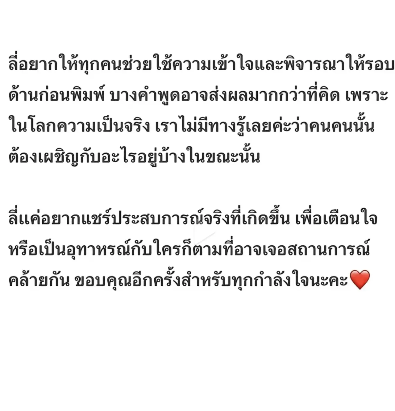 เธอยังบอกอีกว่าความกลัวของแต่ละคนไม่เหมือนกัน และเธอเข้าใจที่คนจะมองในมุมที่ต่างกัน เธอไม่เคยมีปัญหากับการแสดงความคิดเห็น แต่ครั้งนี้บางคอมเม้นต์มันแรงไปจริงๆ อยากให้ทุกคนพิจารณาอีกครั้งก่อนพิมพ์ เราไม่มีทางรู้ว่าคนๆ นั้นต้องเผชิญอะไรอยู่