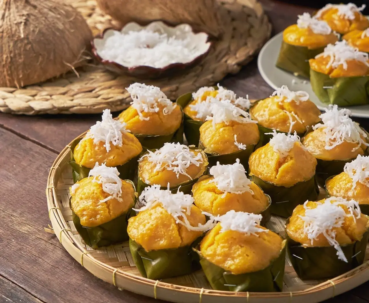 - โรยหน้าด้วยมะพร้าวขูด แล้วนำไปนึ่งในน้ำเดือดจัดประมาณ 15 นาที