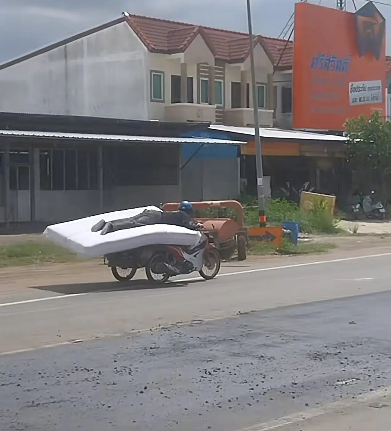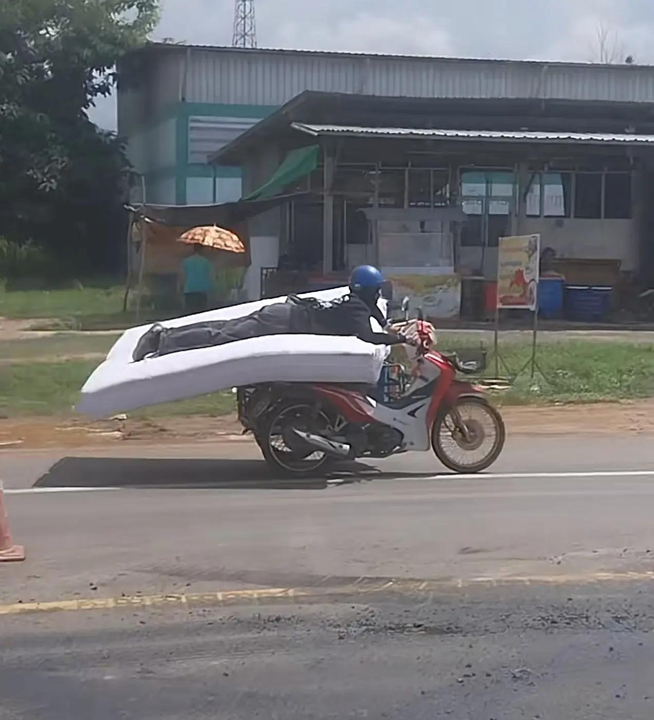 เมื่อต้องส่งฟูกที่นอนด้วยสามล้อพ่วง แต่ฟูกดันใหญ่เกินไป ก็นอนขับไปเลยสิจ๊ะ โคตรจึ้ง!! 🤣