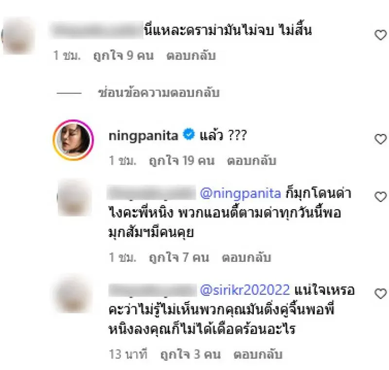 ดูเหมือนจะเป็นถ้อยคำสั้นๆ ที่จุดประกายไฟ เพราะต่อมาทางหนิง ปณิตา ไม่ได้นิ่งเฉย และได้ตอบกลับคอมเมนต์นั้นว่า