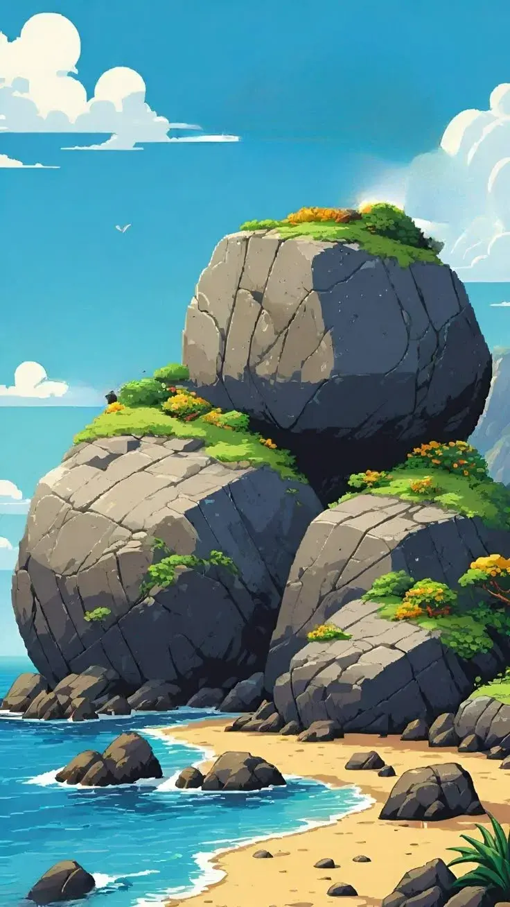 เขาปีนเข้าไปในรอยแยกระหว่างก้อนหินสองก้อนบนชายหาด