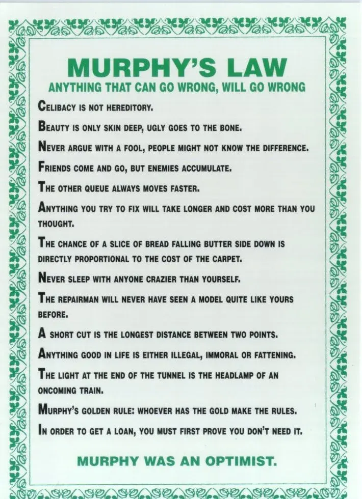 “Anything that can go wrong will go wrong.” หรือ “อะไรก็ตามที่อาจผิดพลาดได้ มันจะผิดพลาด” ซึ้งเป็นทฤษฎีที่ใช้เขาอธิบายเรื่องของความโชคร้าย หรือความผิดพลาดที่เกิดขึ้น ว่าทุกสิ่งที่สามารถผิดพลาดได้ มักจะผิดพลาดเสมอ โดย เอ็ดเวิร์ด อลอยเซียส เมอร์ฟี จูเนียร์ อดีตวิศวกรกองทัพอากาศสหรัฐ ซึ่งได้ทำการทดลองเกี่ยวกับแรง G-Force แต่ในระหว่างการทดลองเกิดข้อผิดพลาดขึ้น