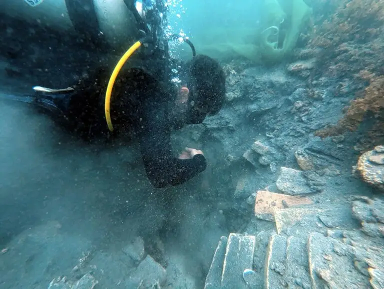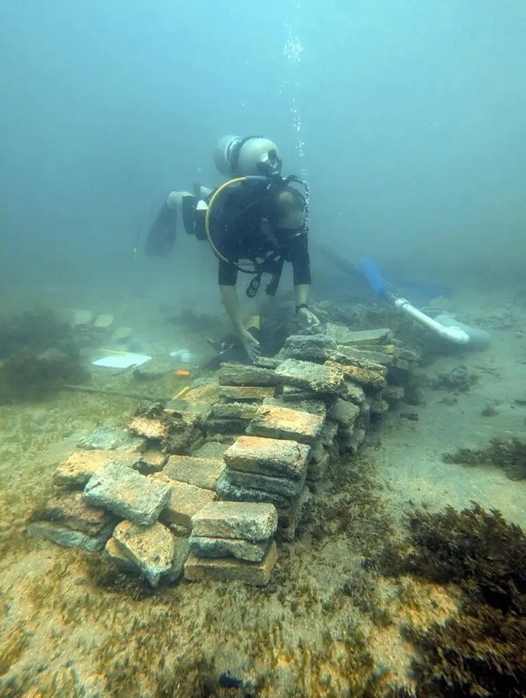 เดวิด เกรกอรี นักโบราณคดีทางทะเลและศาสตราจารย์วิจัยจากพิพิธภัณฑ์แห่งชาติเดนมาร์กที่กองอิฐบนพื้นทะเลในคอสตาริกา