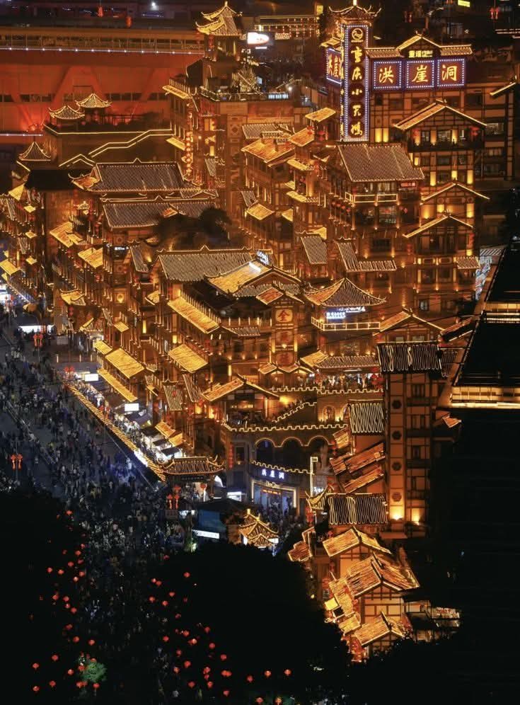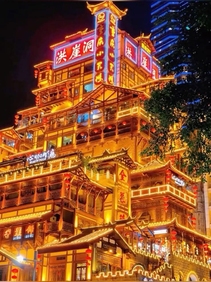 ยามค่ำคืนของฉงชิ่งคือที่สุดของความตระการตา เมืองทั้งเมืองสว่างไสวด้วยแสงไฟจากอาคารสไตล์นีโอจีน และแลนด์มาร์กชื่อดังอย่าง “หงหยาต้ง” (Hongyadong) ที่มีเสน่ห์ไม่ต่างจากปราสาทในเทพนิยายริมแม่น้ำแยงซีเกียง