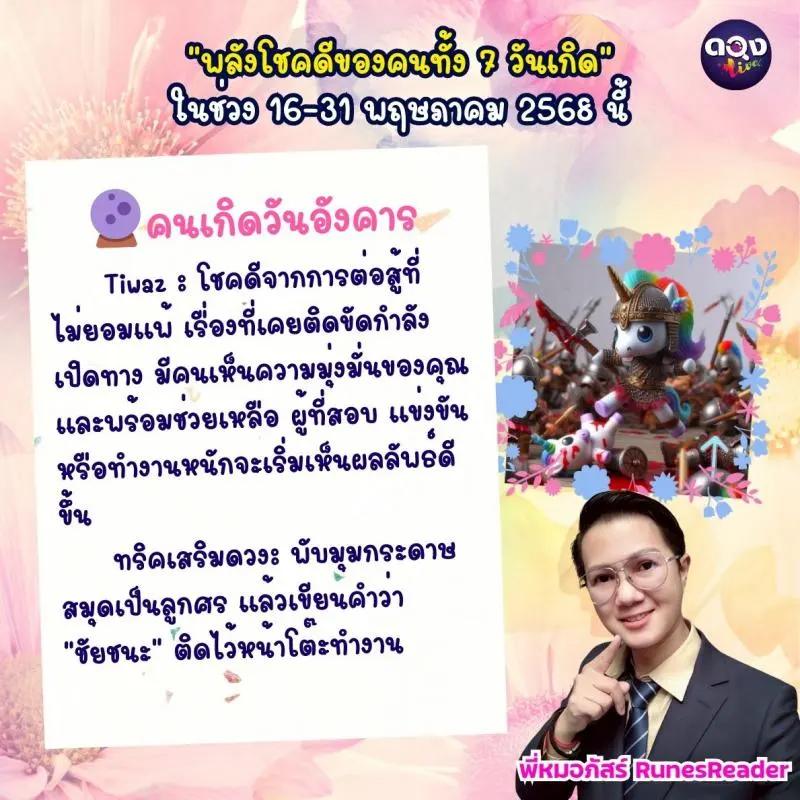 🔮 คนเกิดวันอังคาร Tiwaz : โชคดีจากการต่อสู้ที่ไม่ยอมแพ้ เรื่องที่เคยติดขัดกำลังเปิดทาง มีคนเห็นความมุ่งมั่นของคุณและพร้อมช่วยเหลือ ผู้ที่สอบ แข่งขัน หรือทำงานหนักจะเริ่มเห็นผลลัพธ์ดีขึ้น ทริคเสริมดวง: พับมุมกระดาษสมุดเป็นลูกศร แล้วเขียนคำว่า “ชัยชนะ” ติดไว้หน้าโต๊ะทำงาน