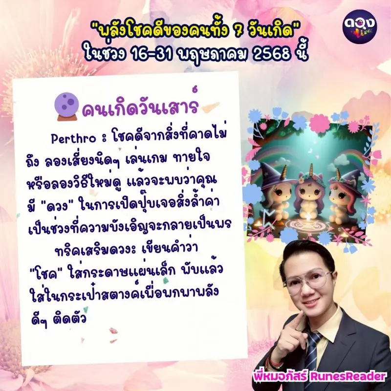🔮 คนเกิดวันเสาร์ Perthro : โชคดีจากสิ่งที่คาดไม่ถึง ลองเสี่ยงนิดๆ เล่นเกม ทายใจ หรือลองวิธีใหม่ดู แล้วจะพบว่าคุณมี “ดวง” ในการเปิดปุ๊บเจอสิ่งล้ำค่า เป็นช่วงที่ความบังเอิญจะกลายเป็นพร ทริคเสริมดวง: เขียนคำว่า “โชค” ใส่กระดาษแผ่นเล็ก พับแล้วใส่ในกระเป๋าสตางค์เพื่อพกพาพลังดีๆ ติดตัว